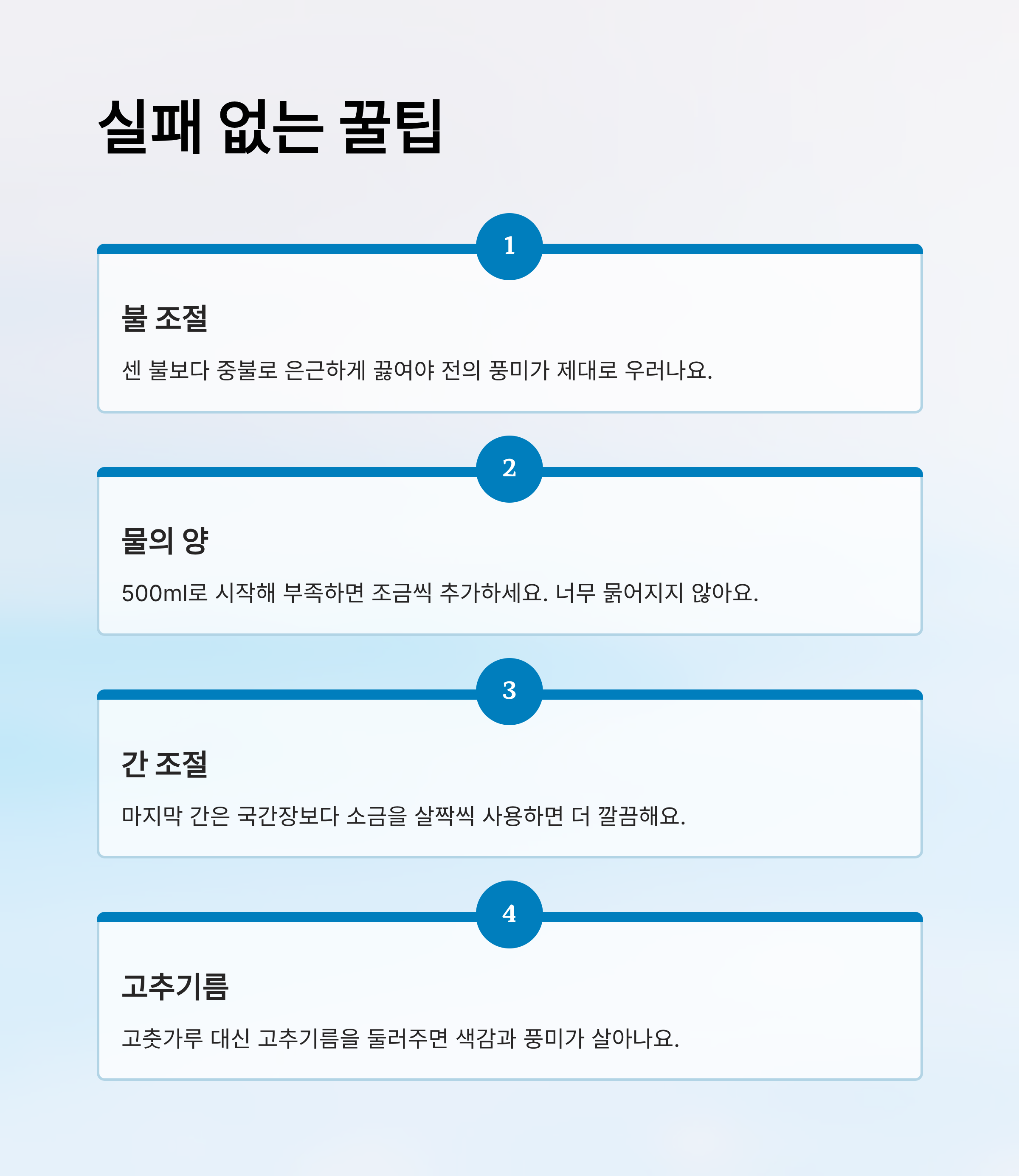 두 번째는 '물의 양 조절'이에요. 전의 수분 함량이 생각보다 높기 때문에, 처음부터 많은 물을 붓지 말고 500ml 기준으로 시작한 뒤 부족하면 나중에 조금씩 추가하는 게 좋아요. 그래야 너무 묽은 국물이 되지 않아요.