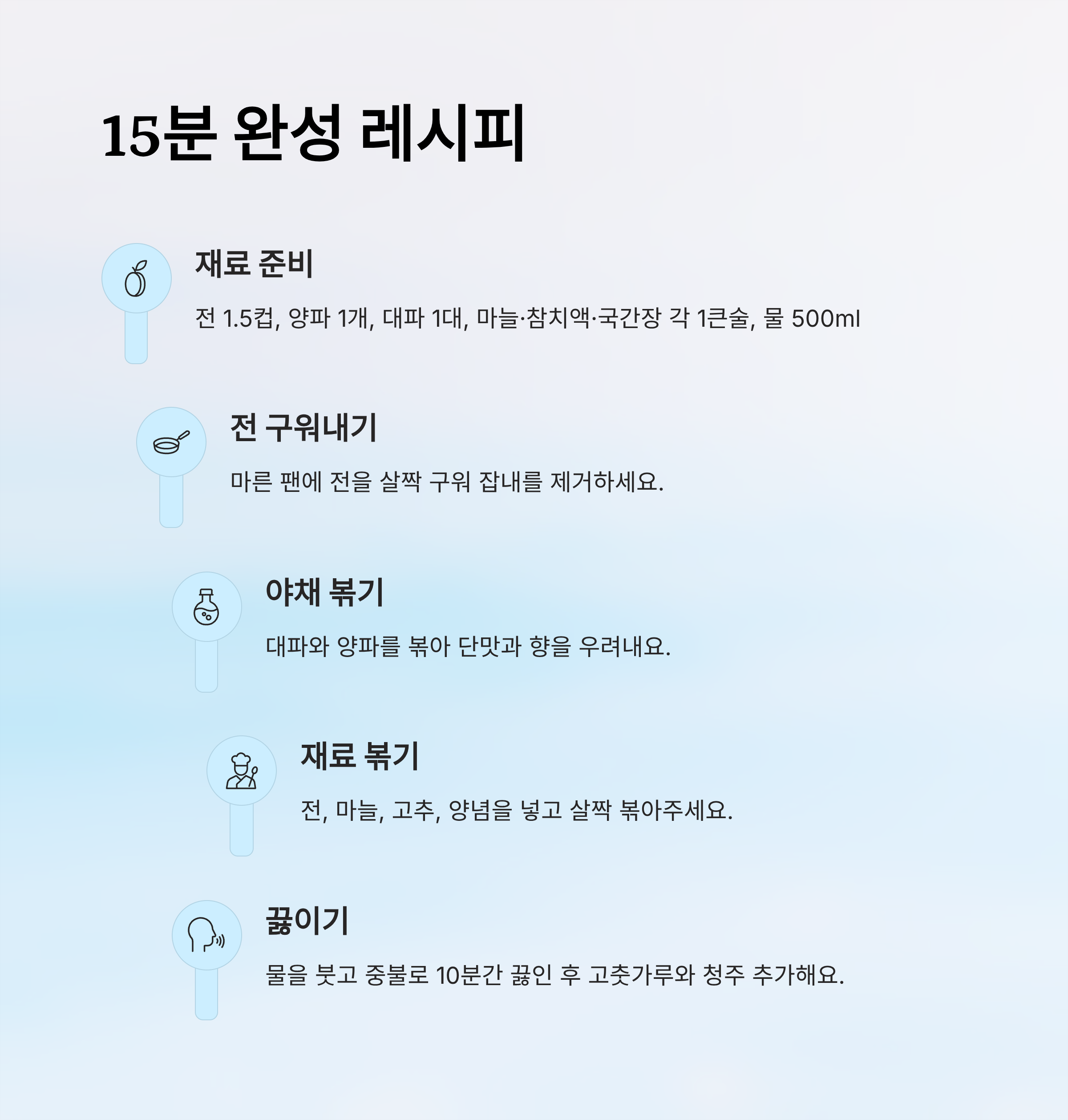 전찌개의 깊은 맛을 내는 핵심은 '재료 본연의 감칠맛'을 제대로 끌어내는 거예요. 육수 없이도 충분히 맛있는 이유는, 이미 전 자체에 간이 되어 있고 기름으로 구워져 풍미가 깊기 때문이죠. 이 맛을 우려내는 방식으로 조리하면 짧은 시간에도 진한 국물이 완성돼요.