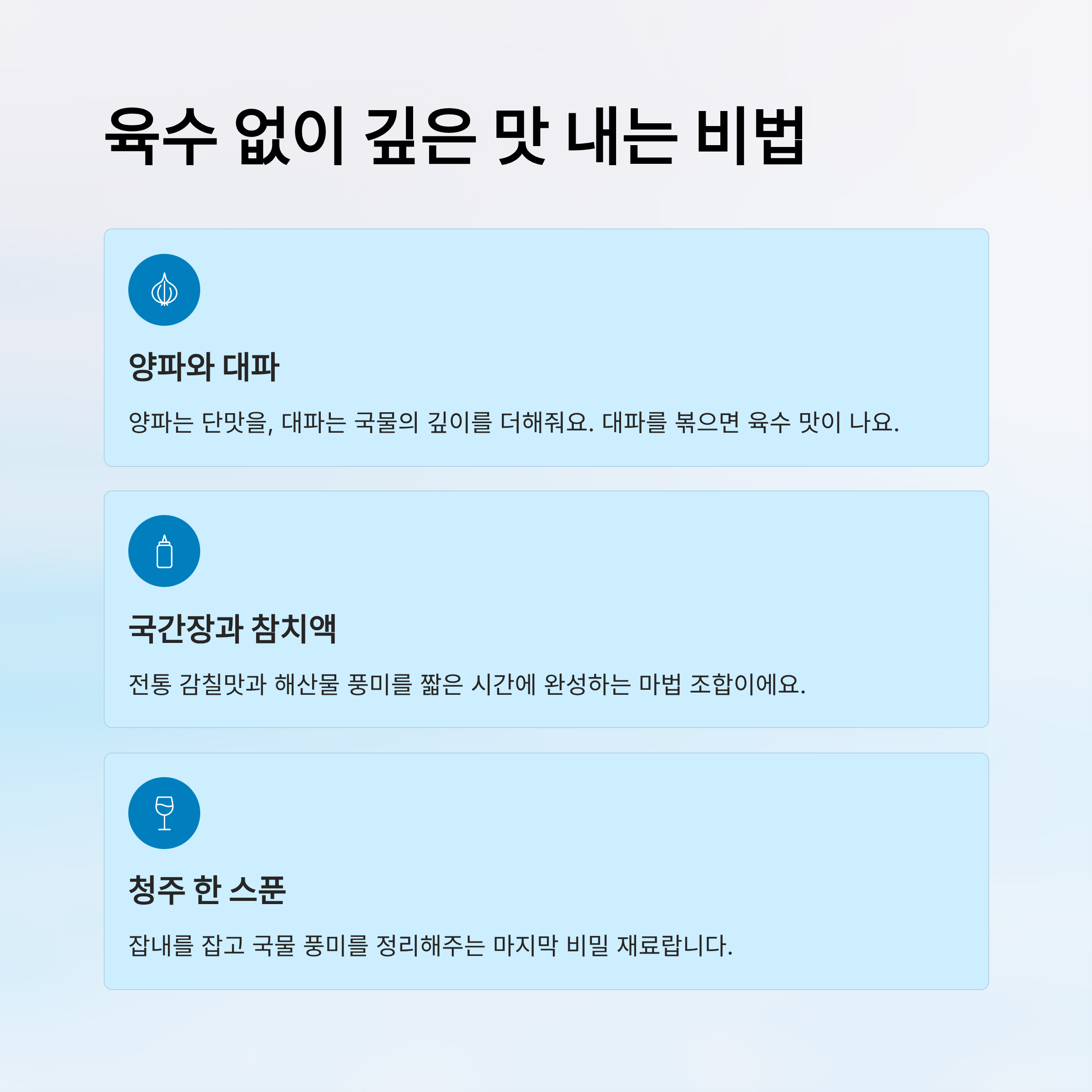 두 번째는 '국간장과 참치액'이에요. 국간장은 전통적으로 깊은 감칠맛을 낼 때 쓰는 재료고, 참치액은 해산물 풍미를 짧은 시간 안에 불어넣을 수 있는 마법 같은 조미료예요. 단, 너무 많이 넣으면 짜지기 쉬우니 꼭 적정량만 사용하는 게 포인트예요.