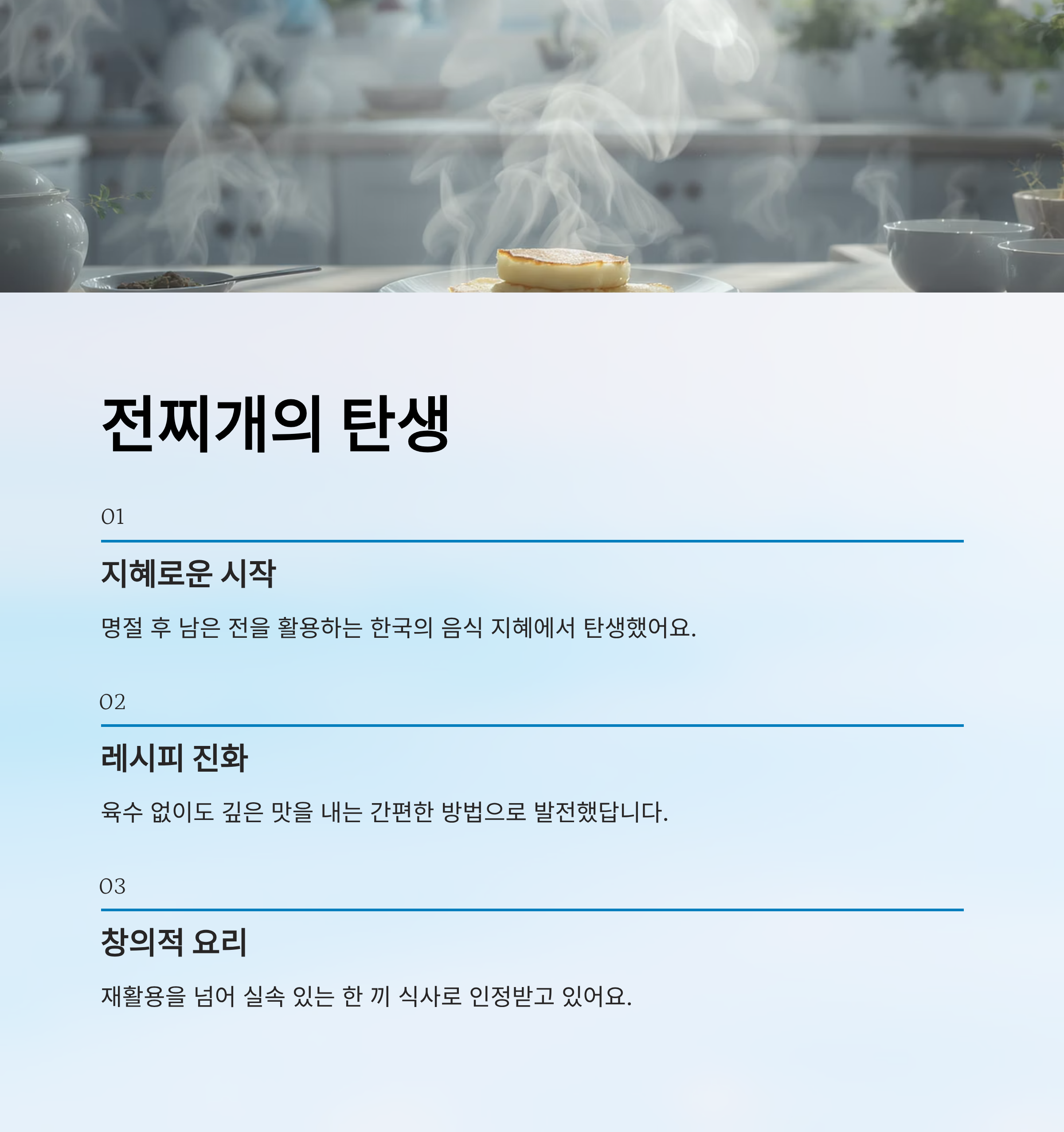 🍽️ 인트로와 목차, 1문단, 2문단까지 먼저 소개했어요! 지금부터는 본격적으로 전찌개의 역사부터 레시피 비법까지 총 7문단을 3개 박스로 나눠서 자세히 보여드릴게요. 귀찮은 과정은 하나도 없이 완벽한 맛, 바로 시작할게요!