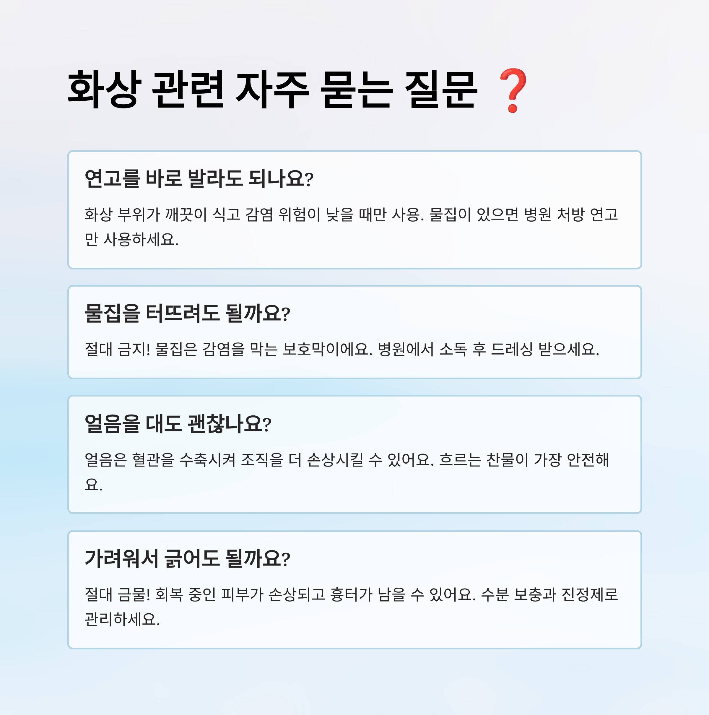 A1. 연고는 화상 부위가 깨끗이 식고, 감염 위험이 낮을 때만 사용해야 해요. 특히 물집이 있거나 터진 부위는 병원에서 처방받은 연고만 쓰는 게 좋아요.