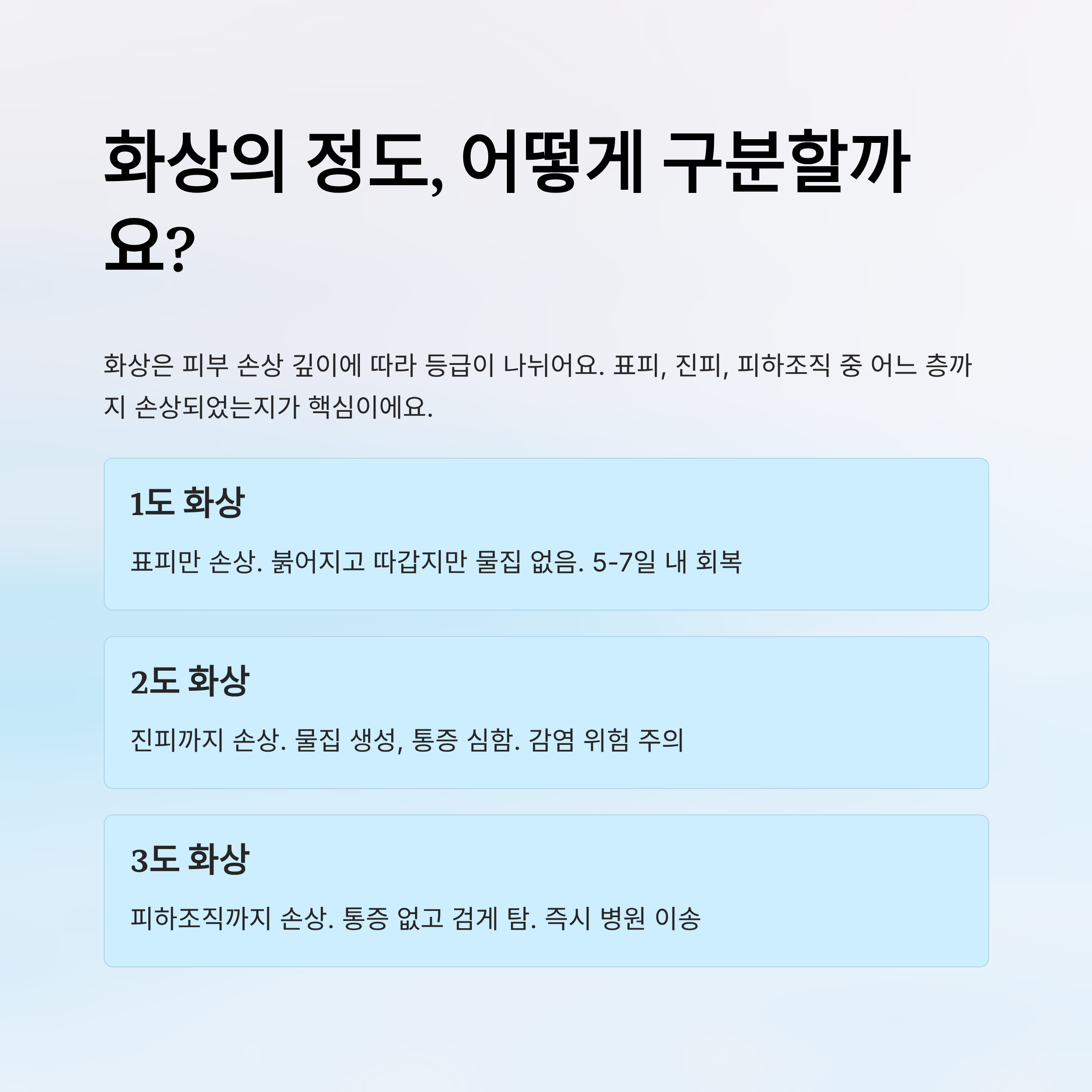 이번 글에서는 사진 없이도 쉽게 판별할 수 있는 화상 구별법과 각 단계별 응급처치 가이드를 소개할게요. “내 화상 몇 도일까?”라는 고민, 이 글로 완벽하게 해결해보세요! 🩹