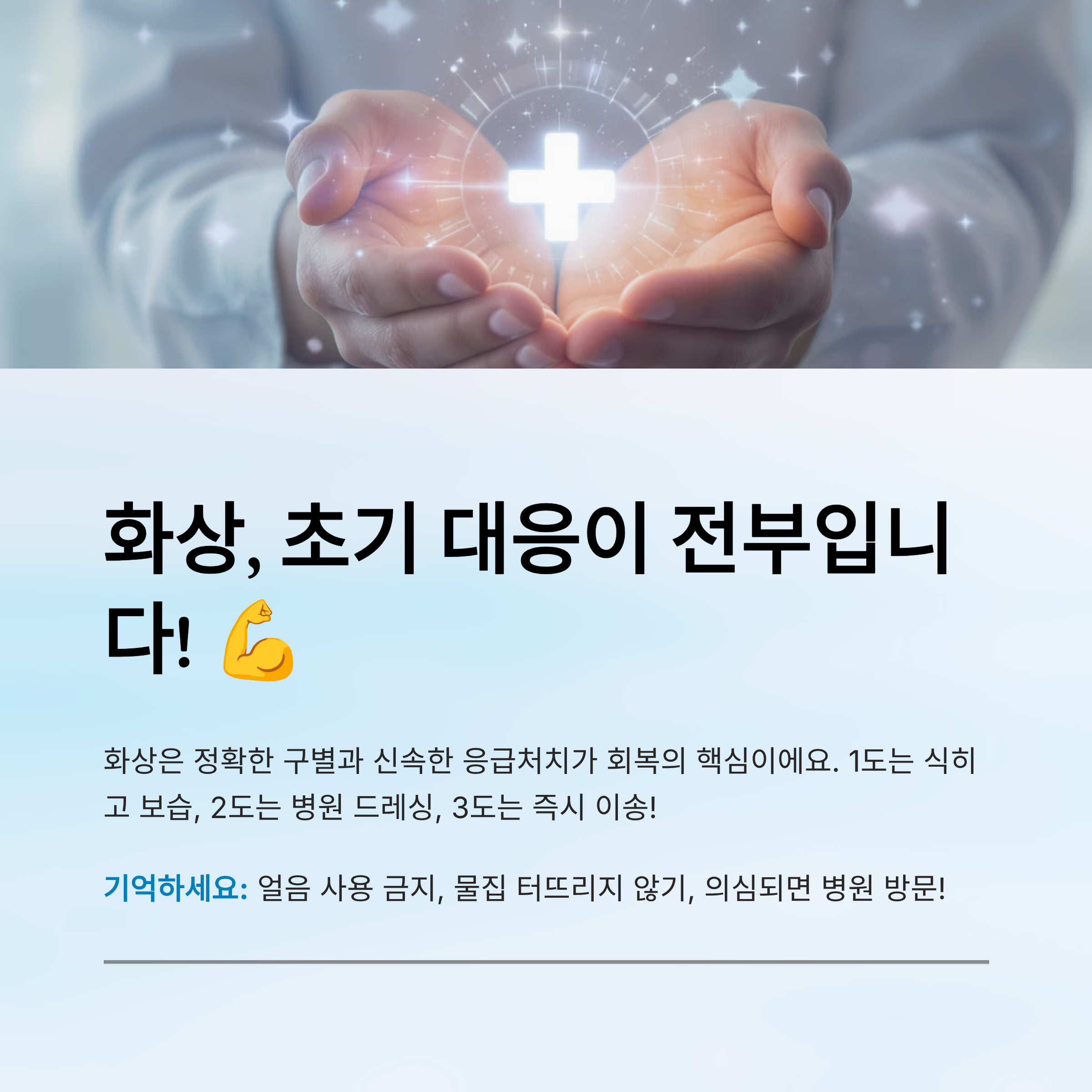 응급처치는 응급처치일 뿐, 완치를 위한 건 아니에요. 화상 후 며칠이 지나도 이상 증상이 계속되면 병원 진료가 최우선이라는 거, 꼭 기억해주세요!