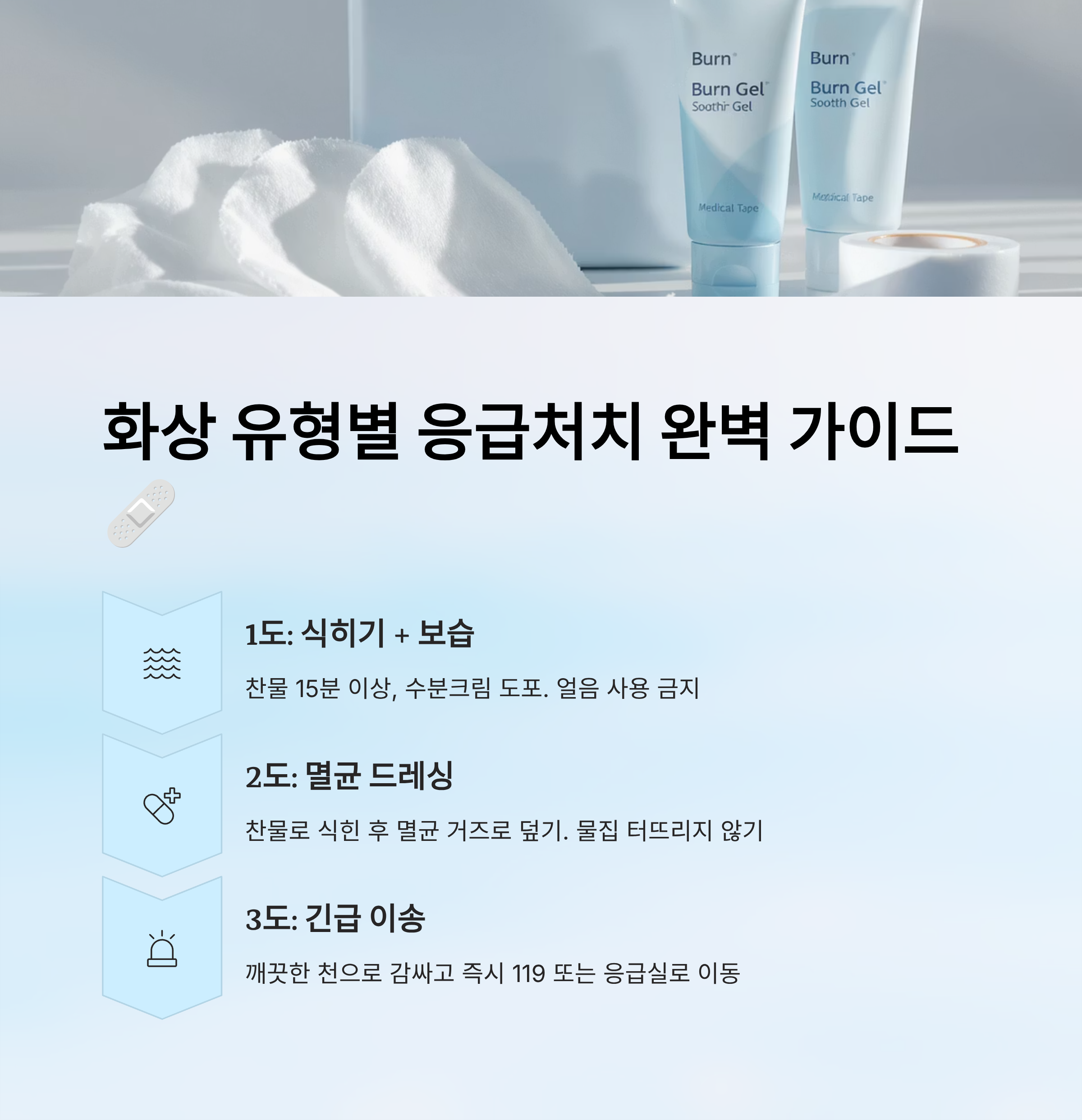 | 2도 | 식히기 + 멸균 드레싱 | 물집 터뜨리지 않기 |