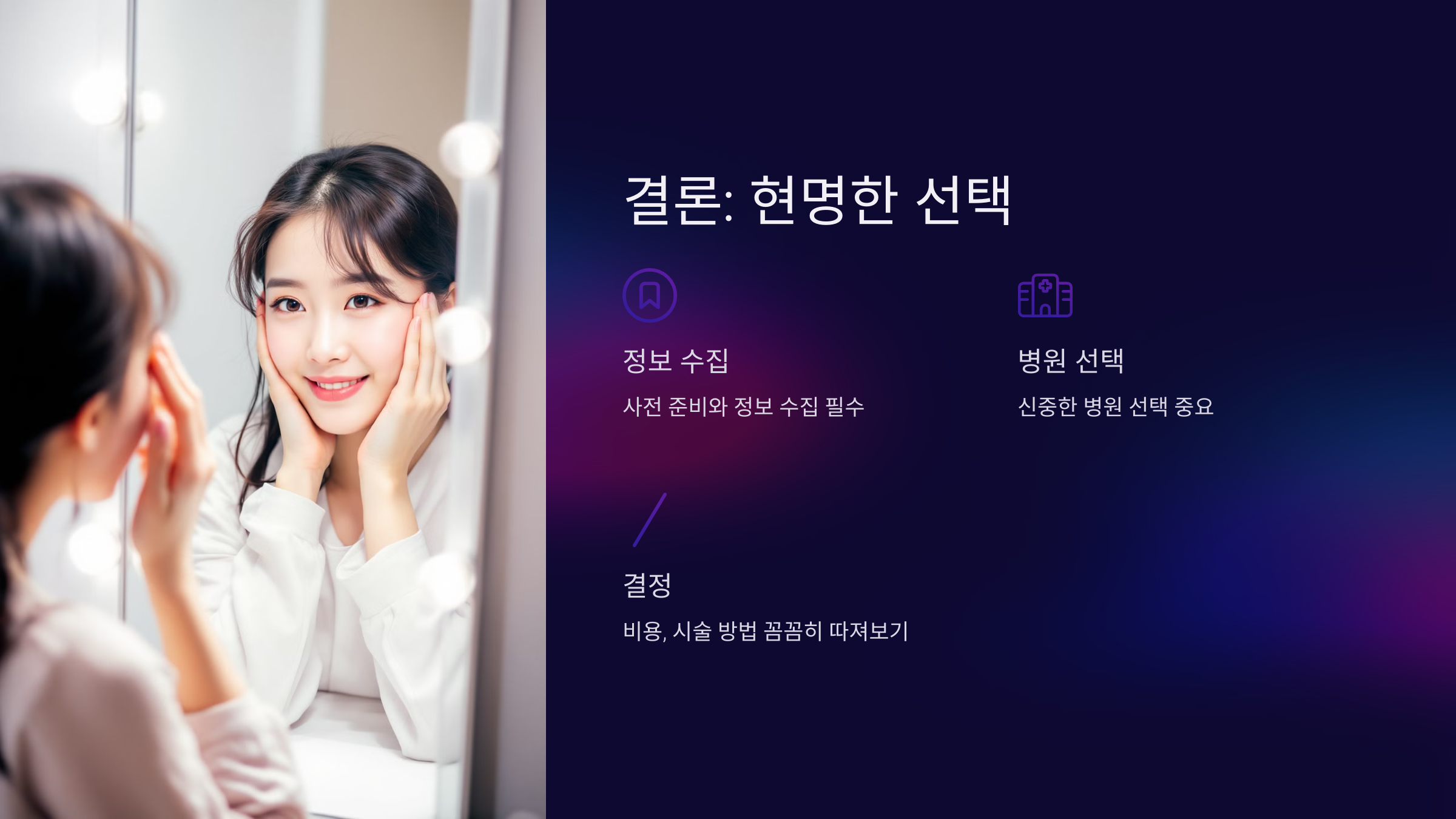 - 인터넷 후기와 실제 방문 상담을 통해 병원의 신뢰도를 판단하세요.