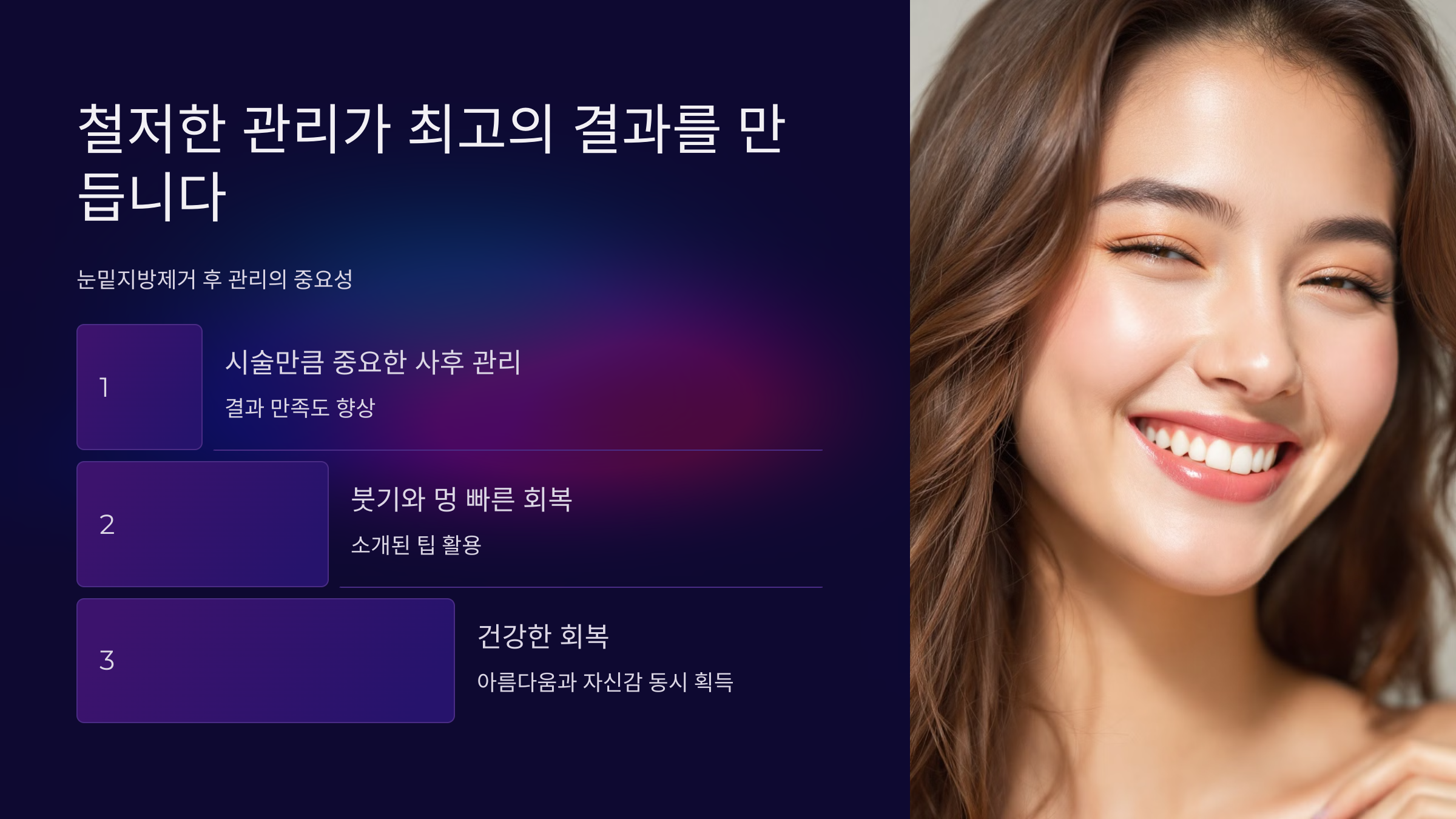 눈밑지방제거는 시술만큼이나 사후 관리가 중요합니다. 관리법을 제대로 지키면 붓기와 멍이 빠르게 가라앉아 결과를 더욱 만족스럽게 느낄 수 있습니다. 오늘 소개한 팁을 활용해 더 빠르고 건강하게 회복하세요. 아름다움과 자신감을 동시에 얻는 여러분을 응원합니다! 😊