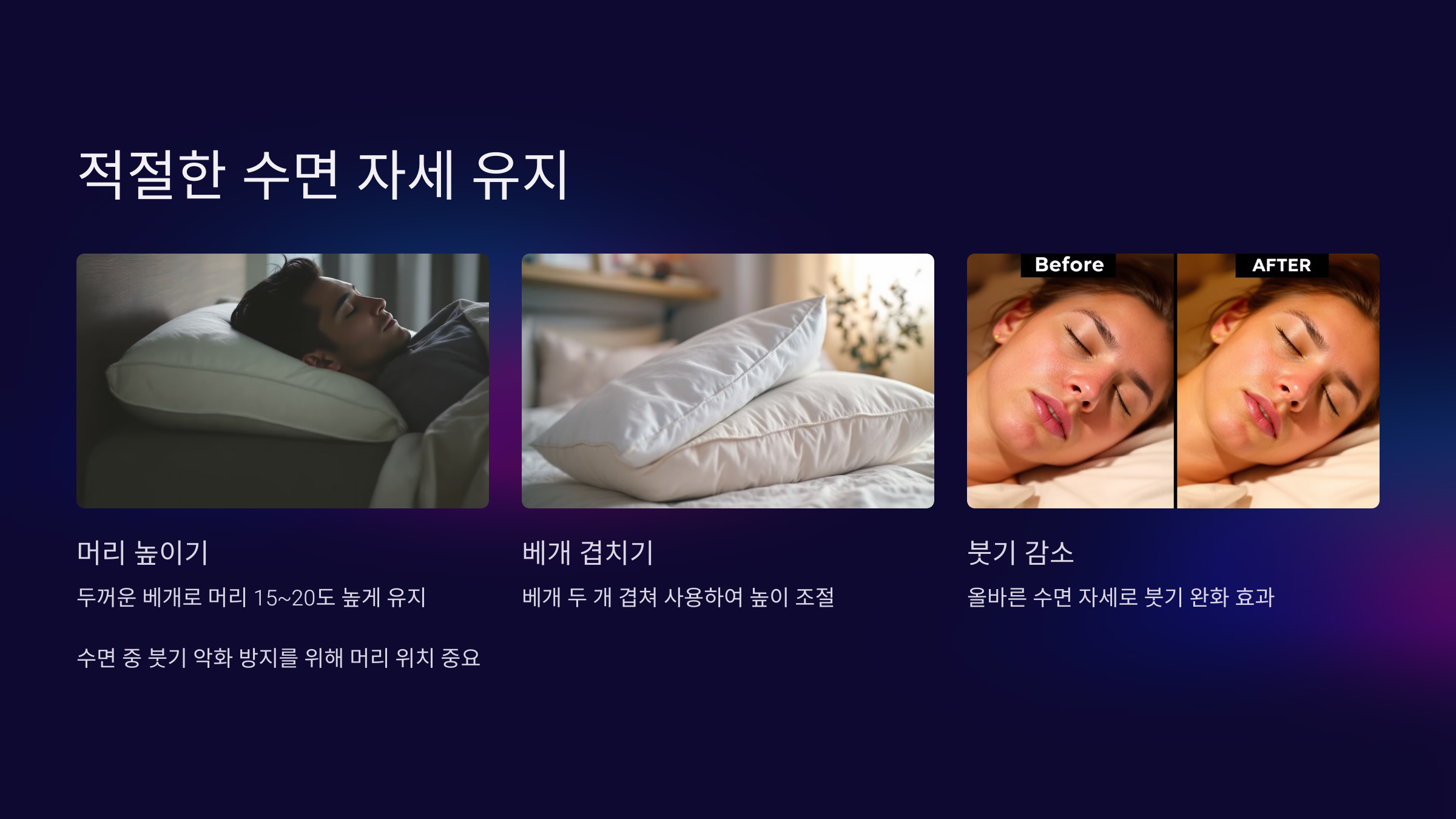 - 수면 중에는 붓기가 더 심해질 수 있으므로 머리를 살짝 높게 유지하세요.