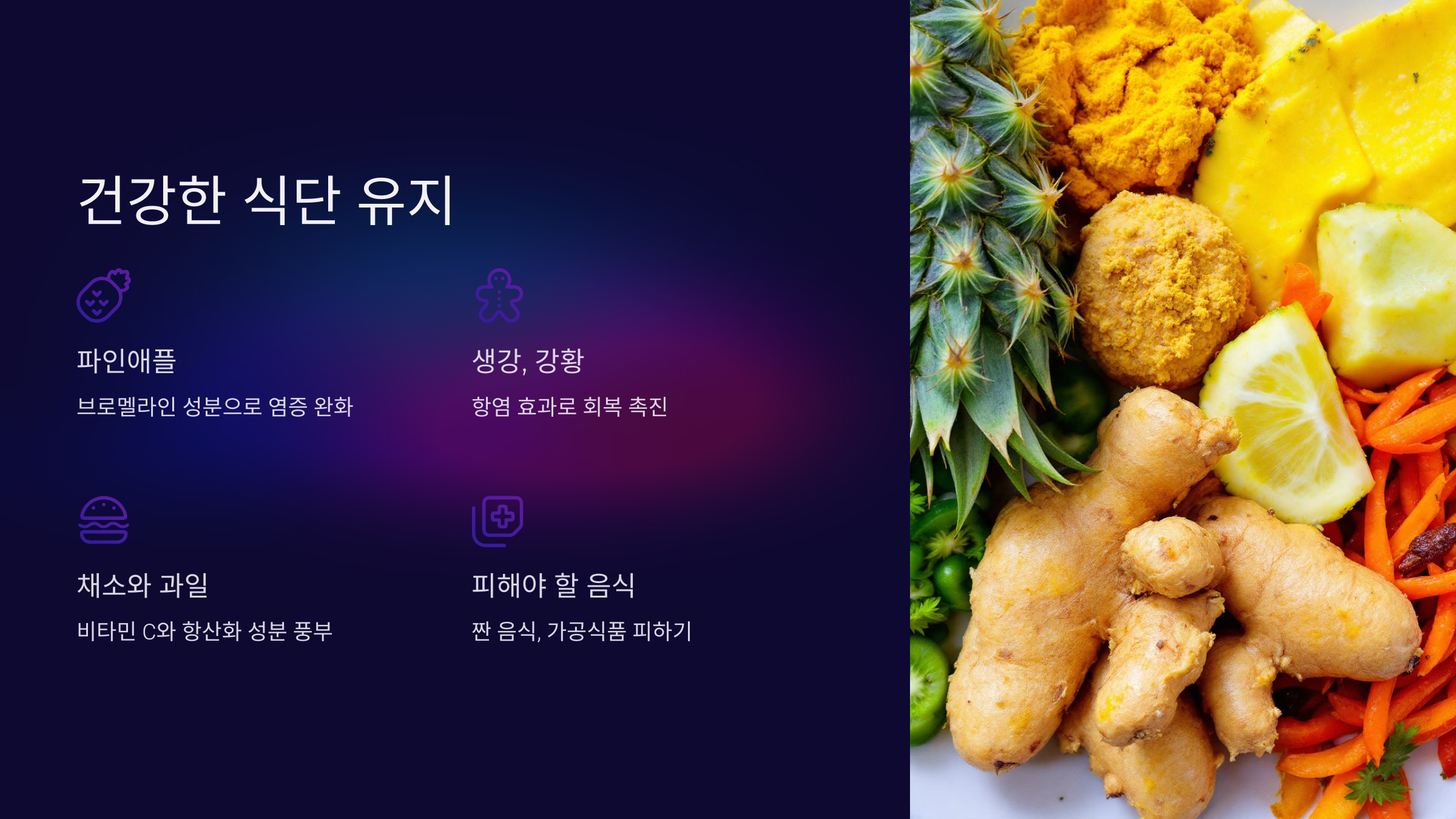 - 염증을 줄이는 음식을 섭취하면 회복 속도가 빨라집니다.
