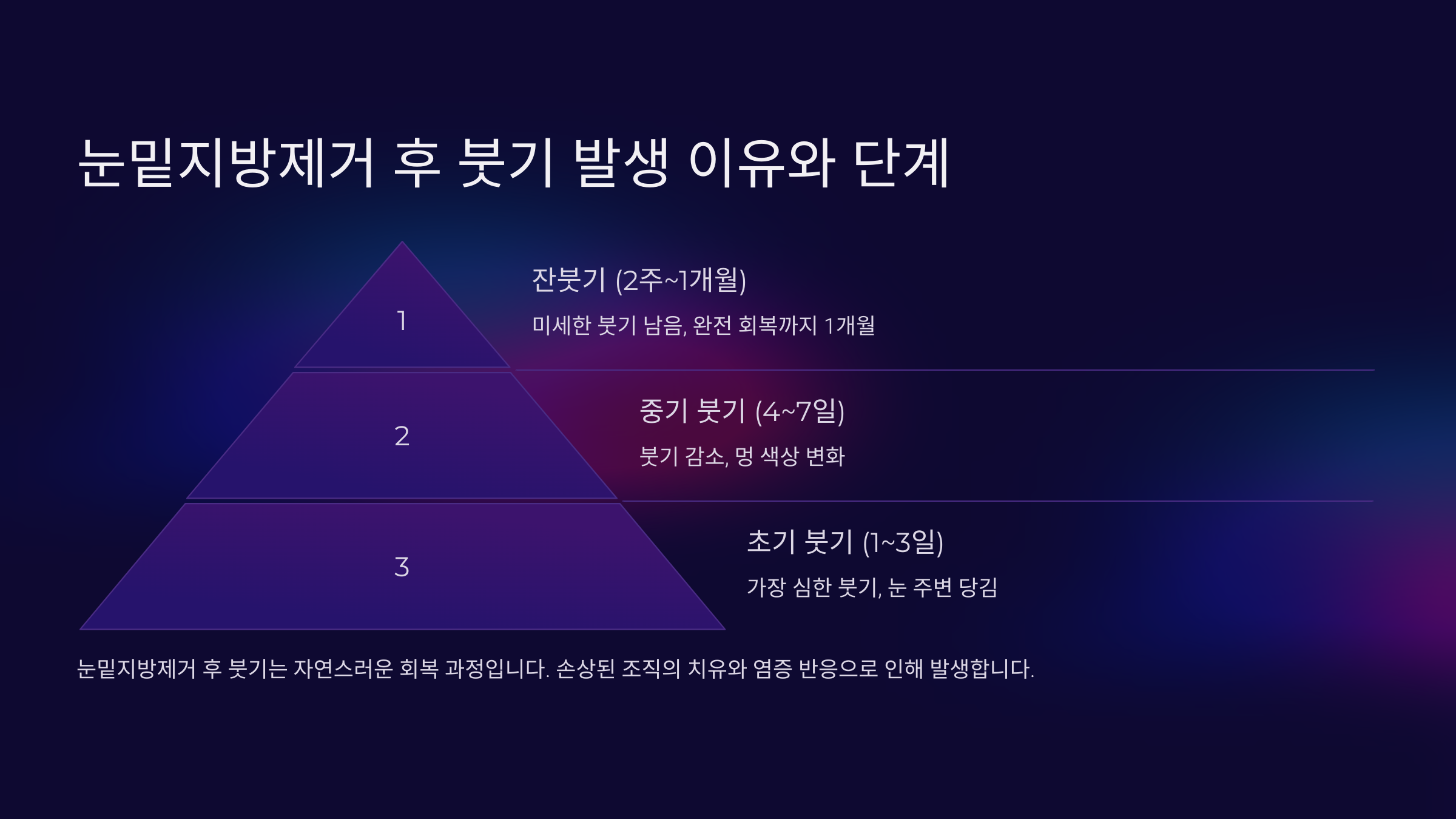 눈밑지방제거 후 붓기가 생기는 것은 자연스러운 회복 과정입니다. 시술 중 손상된 조직이 치유되면서 생긴 염증 반응 때문이죠. 일반적으로 붓기는 다음과 같은 단계를 거칩니다: