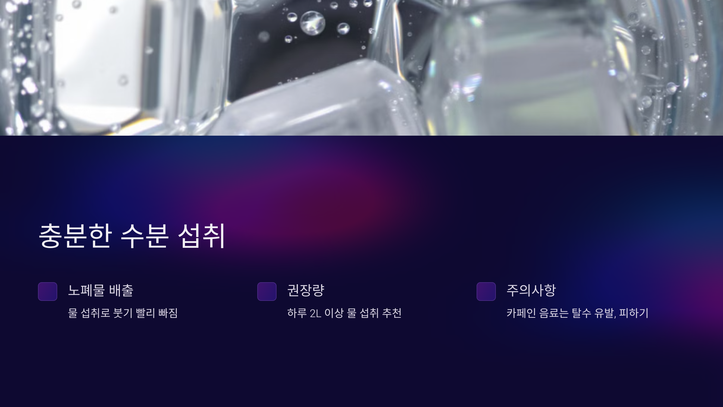 - 물을 충분히 마시면 몸의 노폐물이 배출되면서 붓기가 빨리 빠집니다.