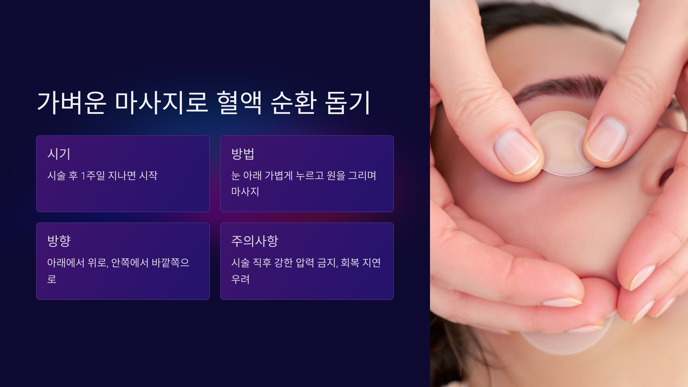 - 시술 후 1주일이 지나면 눈 주변을 부드럽게 마사지하는 것이 도움이 됩니다.