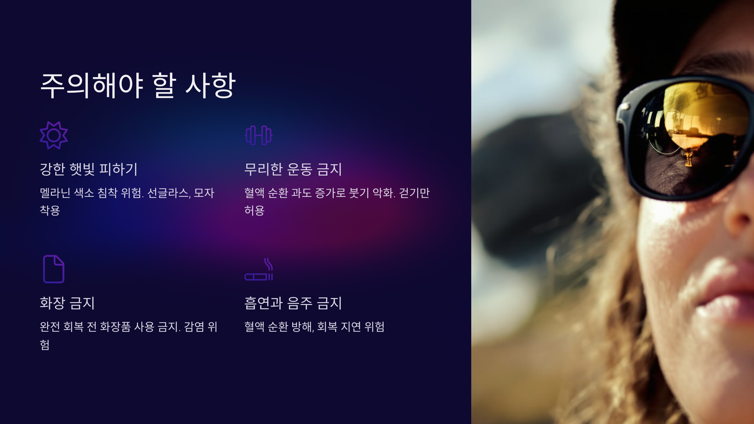 - 시술 부위가 완전히 회복될 때까지 화장품 사용은 피하세요. 감염 위험이 높아질 수 있습니다.