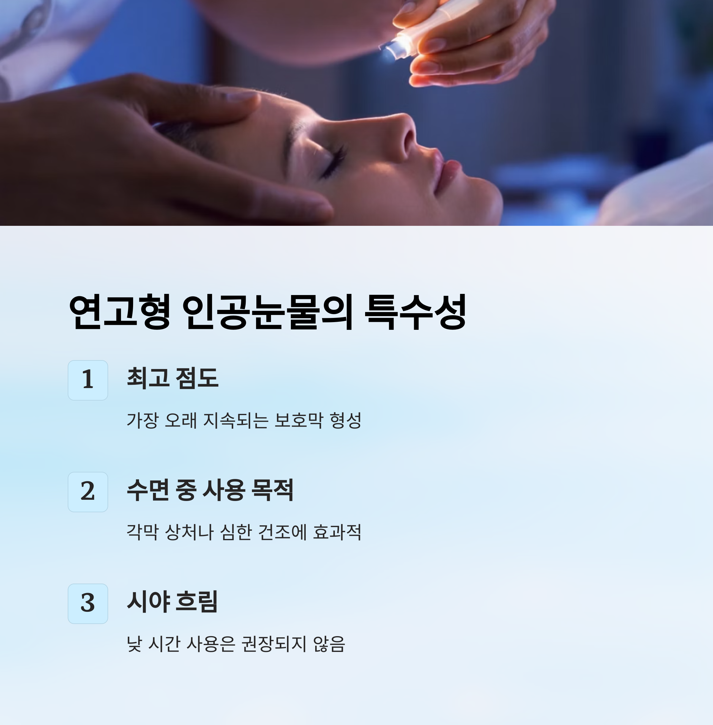 주로 중등도 이상의 건성안 환자나 밤 시간 동안 눈 건조가 심한 분들이 많이 써요. 수면 전에 넣으면 밤새 눈을 보호해줘서 아침에 눈이 덜 뻑뻑하답니다.