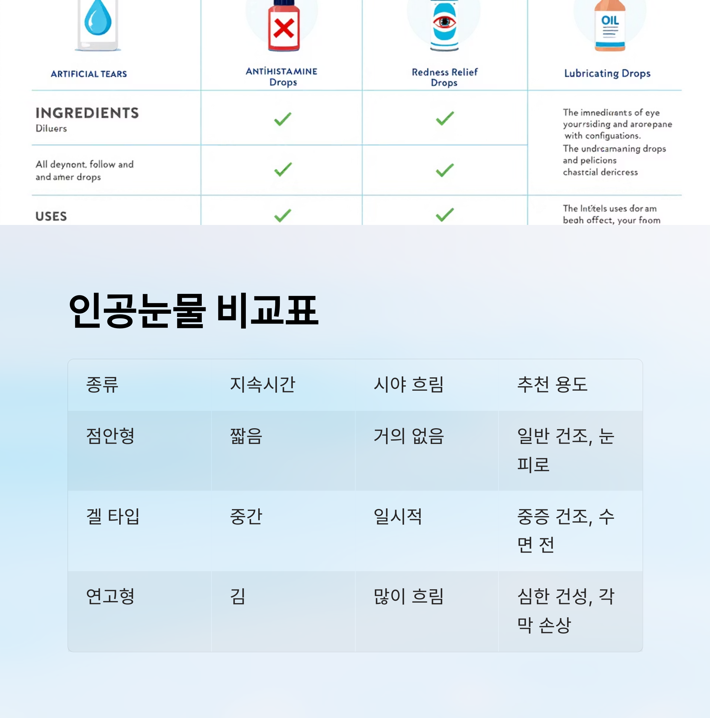 눈 표면에 상처나 염증이 있을 땐 겔이나 연고 타입보다 보습력이 떨어질 수 있어서 증상에 따라 선택하는 게 좋아요.