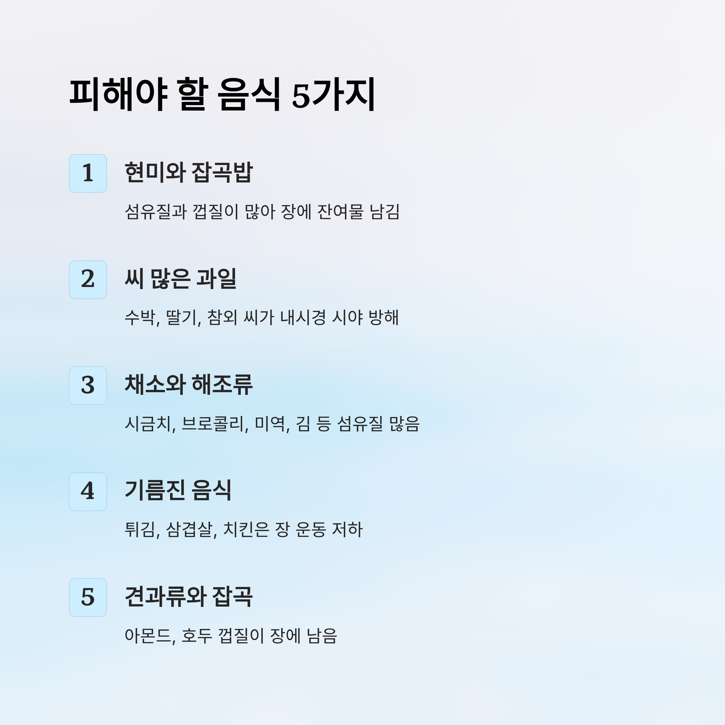 대장내시경 검사 전에 가장 중요한 것은 피해야 할 음식을 확실히 구분하는 거예요. 권장 음식을 먹는 것도 중요하지만, 장에 잔여물을 남기는 음식을 피하지 않으면 검사 결과에 직접적인 영향을 줄 수 있답니다. 그래서 ‘금지 음식 리스트’를 잘 숙지하는 게 핵심이에요.