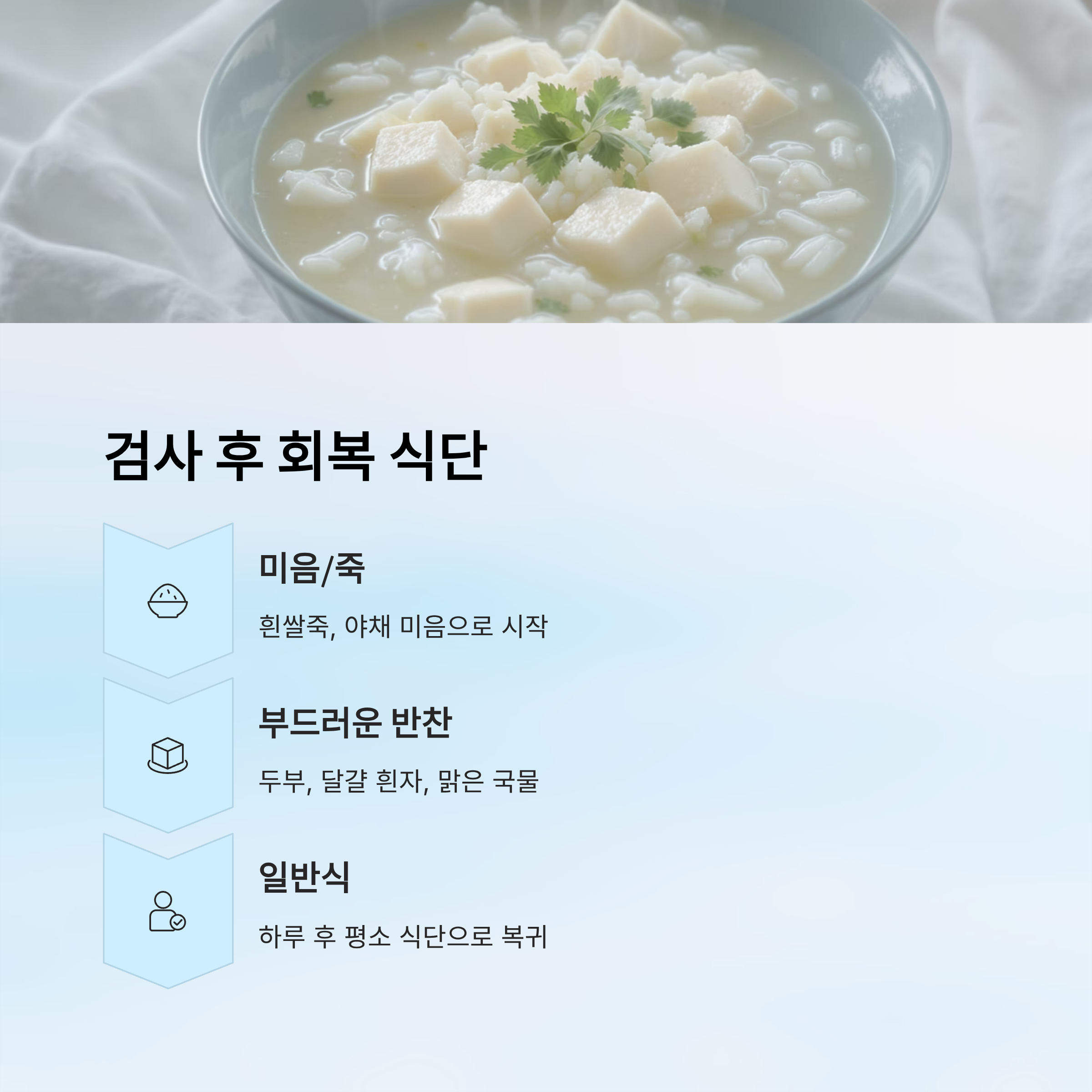 검사 직후에는 가볍게 시작하고, 하루 정도 지나면 평소 식단으로 서서히 돌아가는 게 좋아요. 이렇게 하면 속도 편안해지고 회복도 빨라진답니다. 🥰