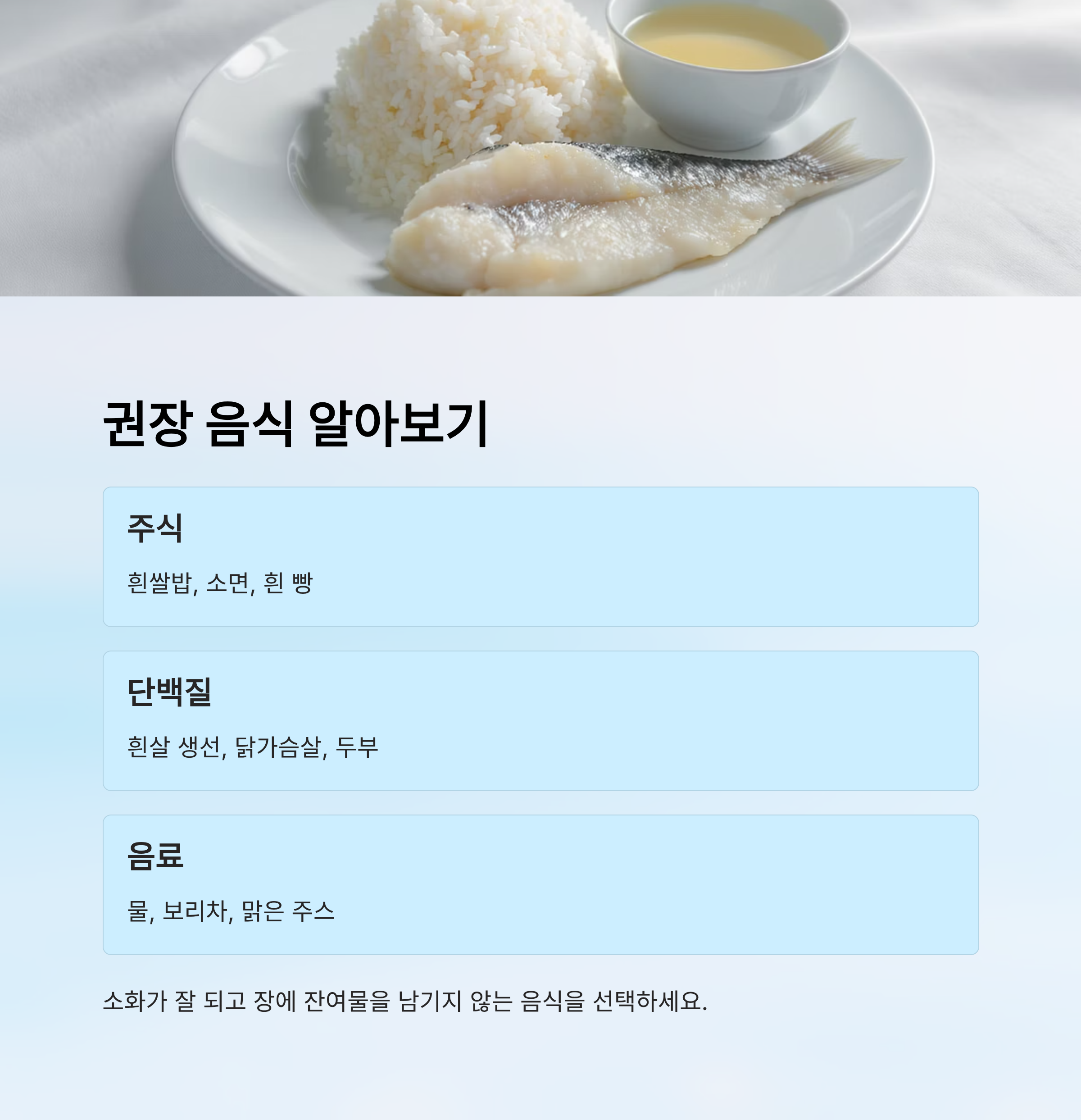 제가 생각했을 때 가장 도움이 되는 건 "죽 → 부드러운 반찬 → 일반식" 순서로 천천히 단계를 밟아가는 식사 방법이에요. 이렇게 하면 장에 무리가 가지 않고 자연스럽게 회복할 수 있어요. 😊