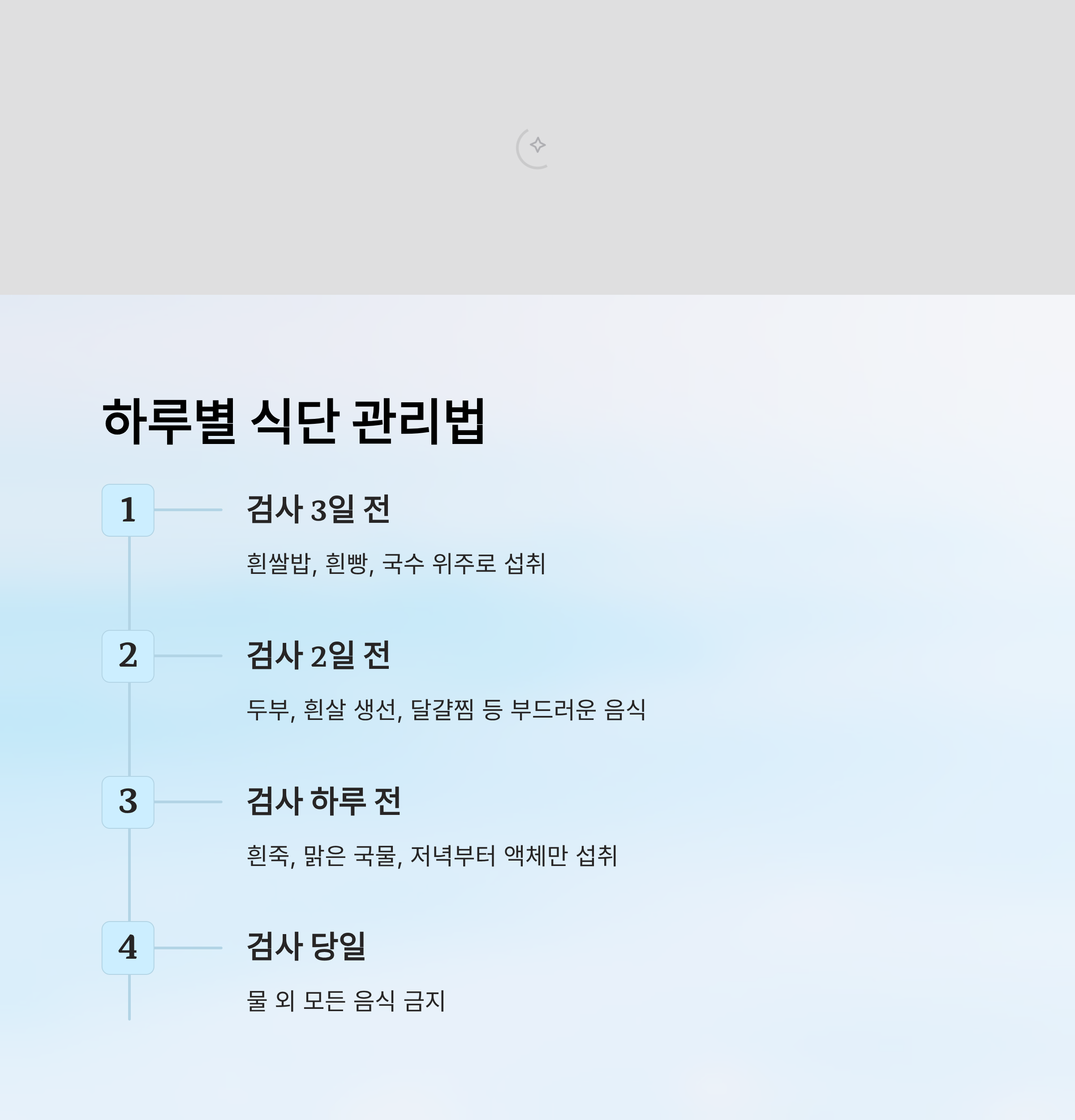 | 검사 3일 전 식단 관리 | 장 청결도 향상 | 섬유질 많은 음식 피하기 |