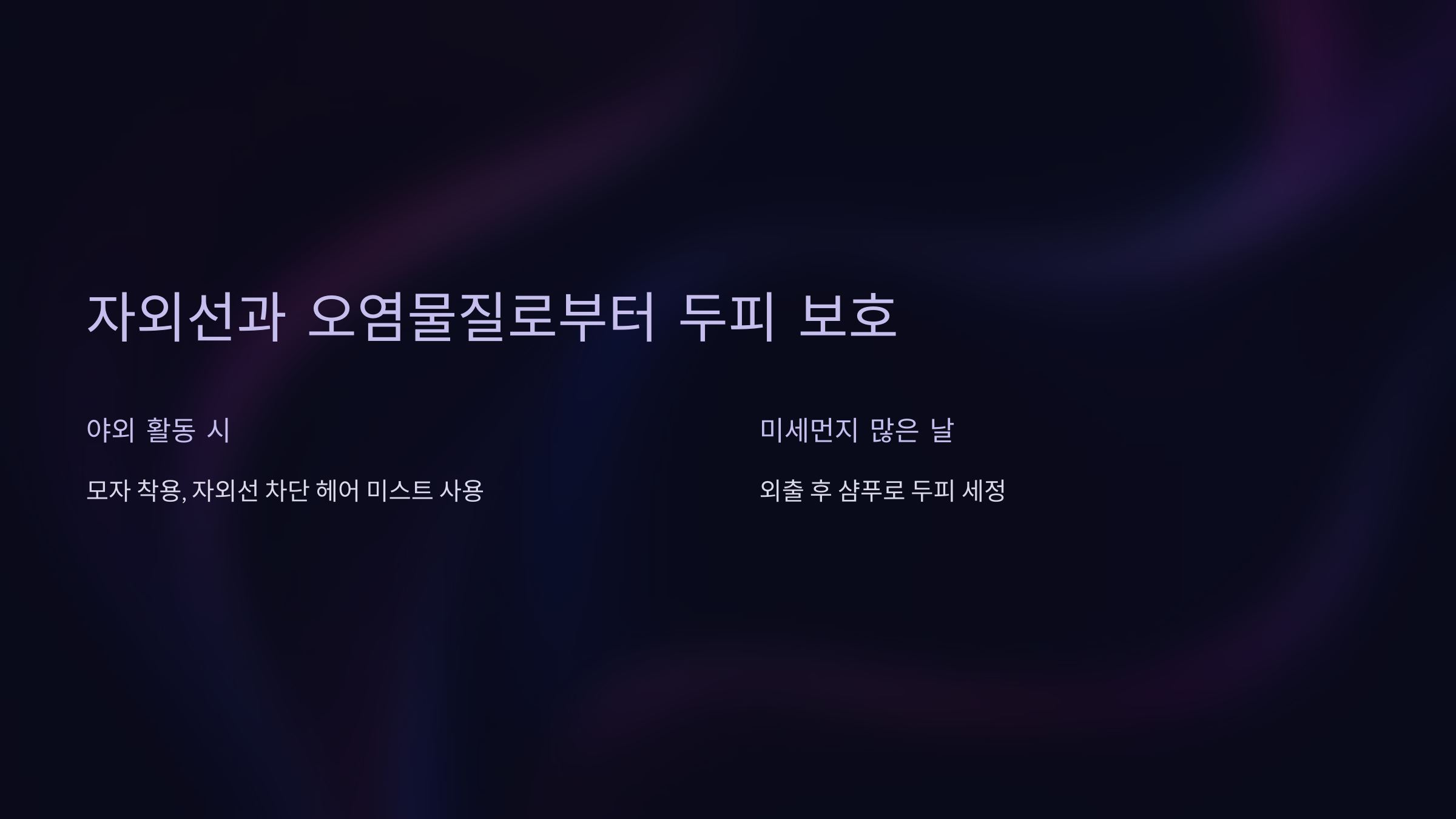 - 야외 활동 시: 모자를 착용하거나 자외선 차단 헤어 미스트 사용