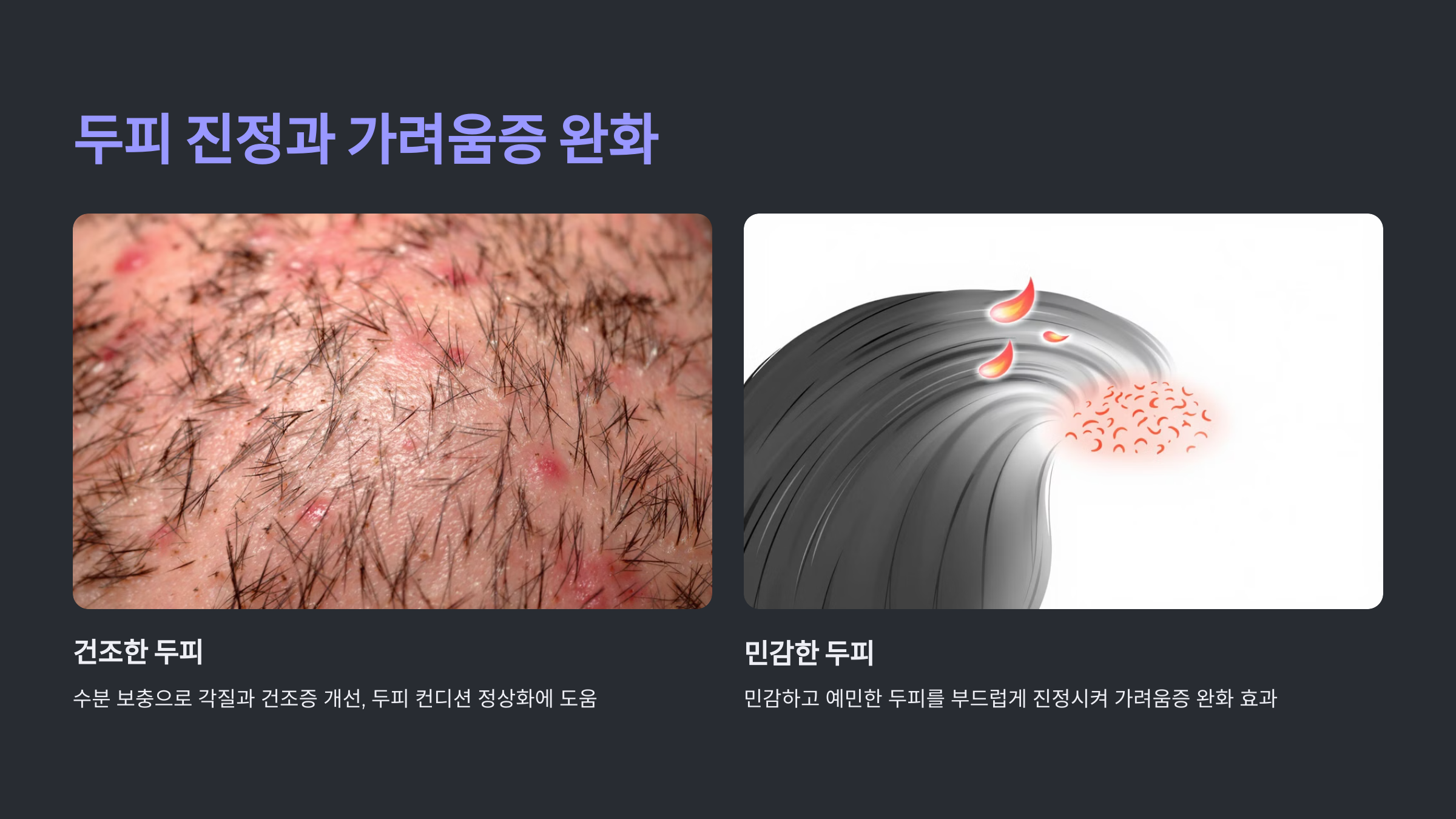 - 특히 지성 두피의 경우, 과도한 피지 분비를 완화하는 데 도움을 줍니다.