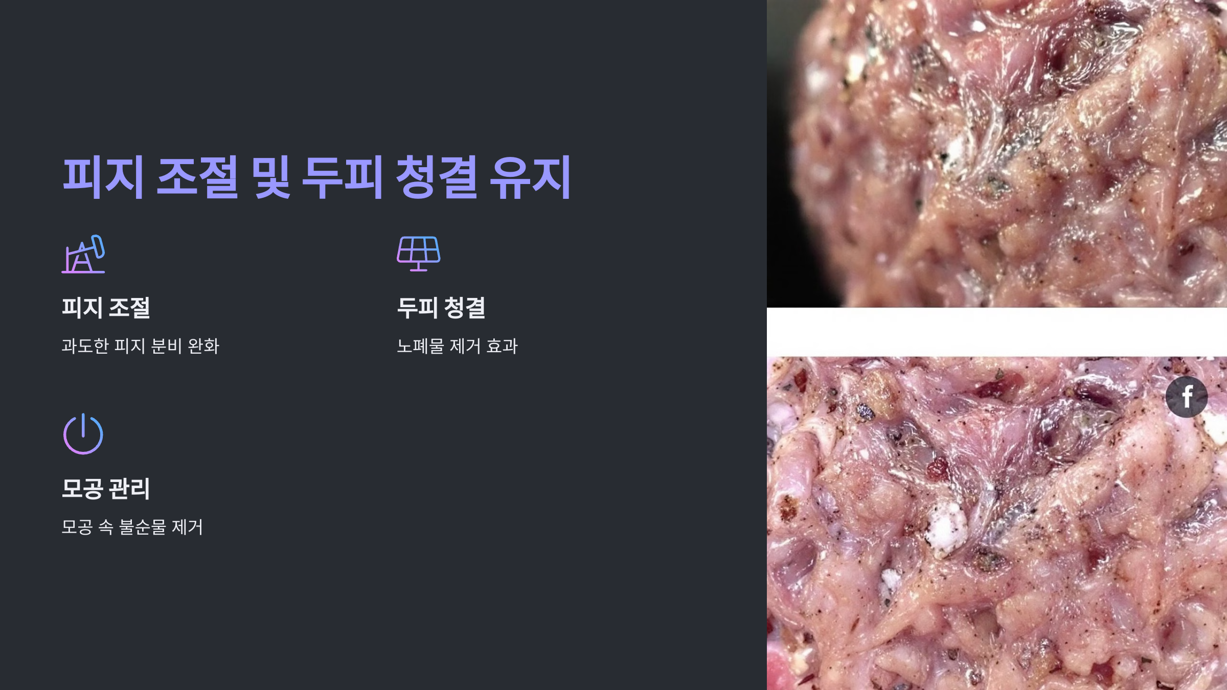- 두피 마사지는 모공 속 피지와 노폐물 제거를 도와 두피 청결 유지에 기여합니다.
