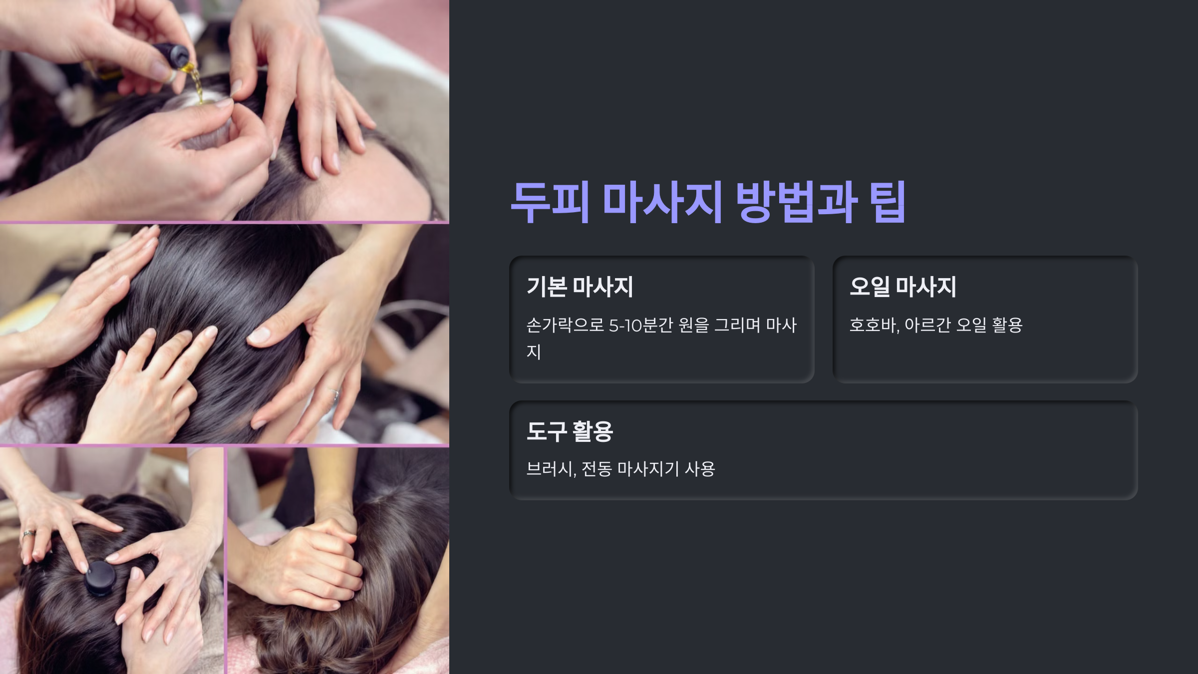 - 사용 도구: 두피 마사지 브러시, 전동 마사지기 등