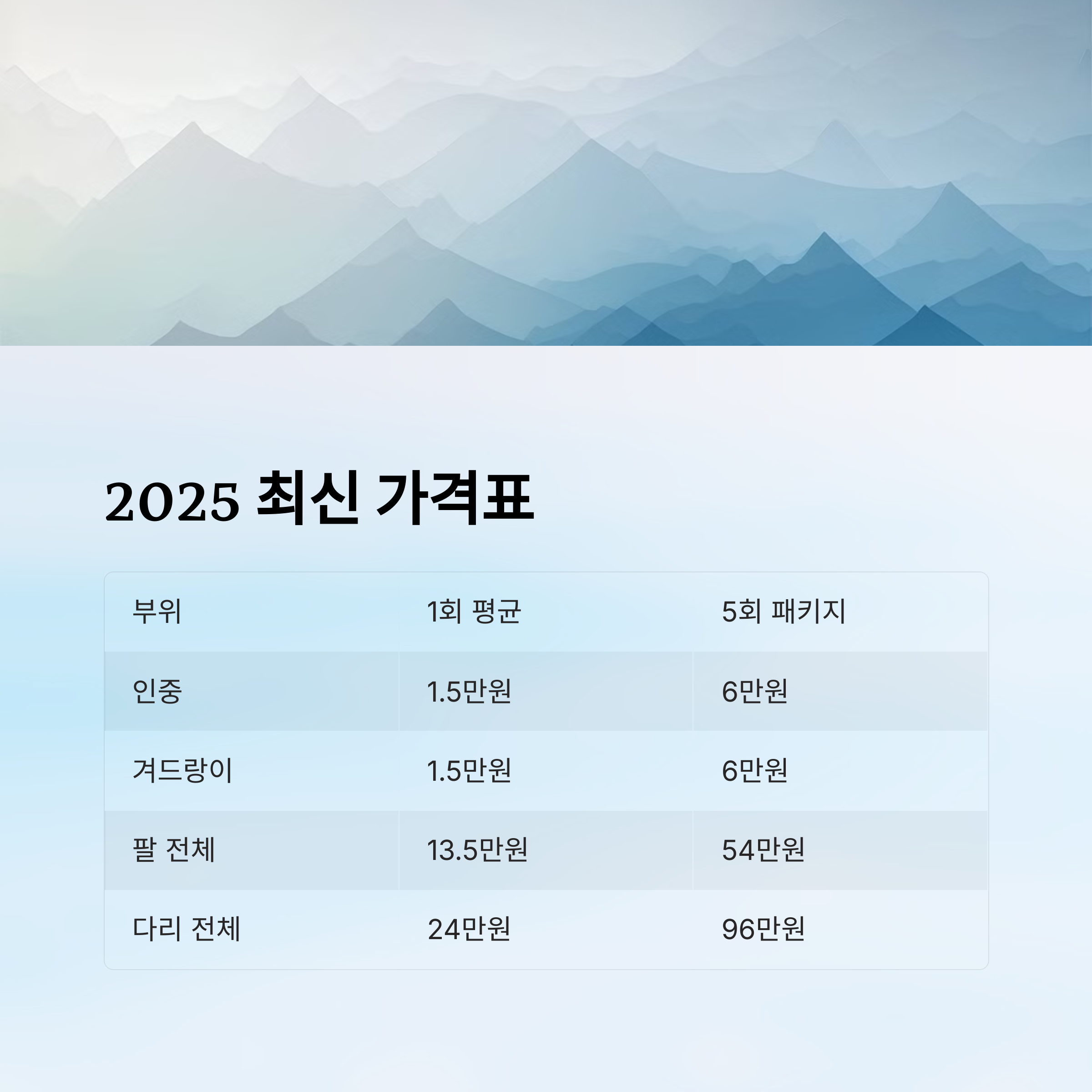 | 다리 전체 | 중 | 30분 | 6회 | 15~25만원/회 |