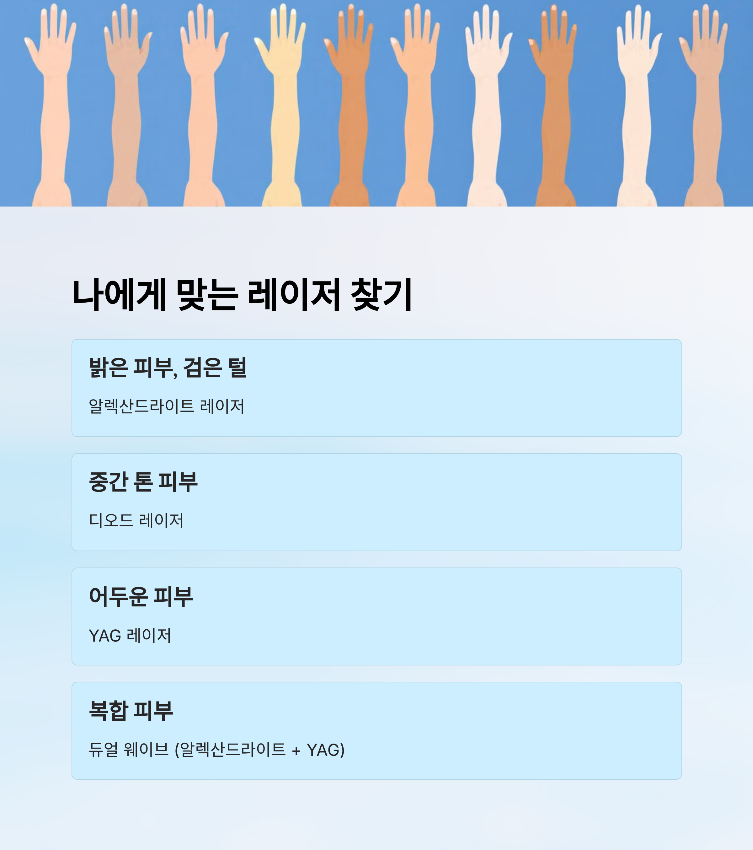 피부 타입에 따라 가장 적절한 레이저를 선택하면 효과는 물론, 부작용도 최소화할 수 있어요. 민감하거나 자주 트러블이 생기는 피부는 시술에 특히 신중해야 해요. 피부색, 털의 굵기, 민감도에 따라 아래처럼 추천드릴 수 있어요.