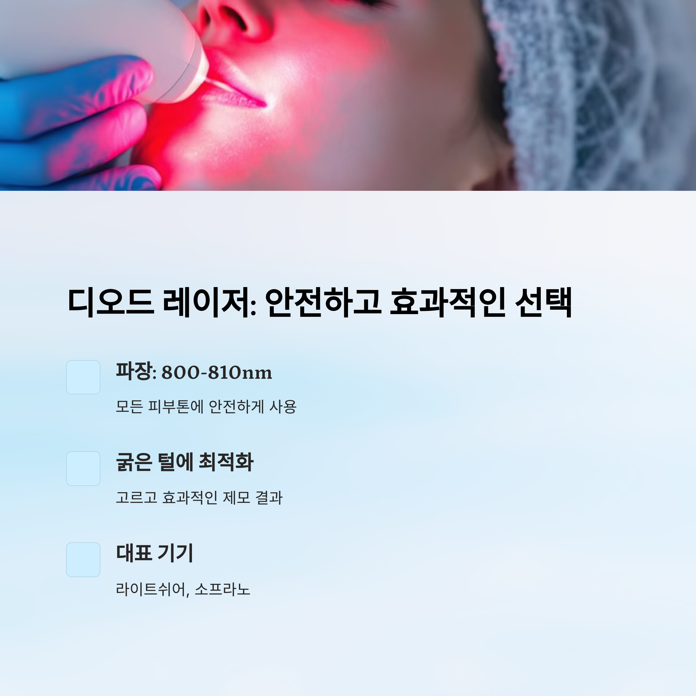 | 중간 톤 피부 + 잔털 | 디오드 | 자극 적고 민감 부위에 적합 |