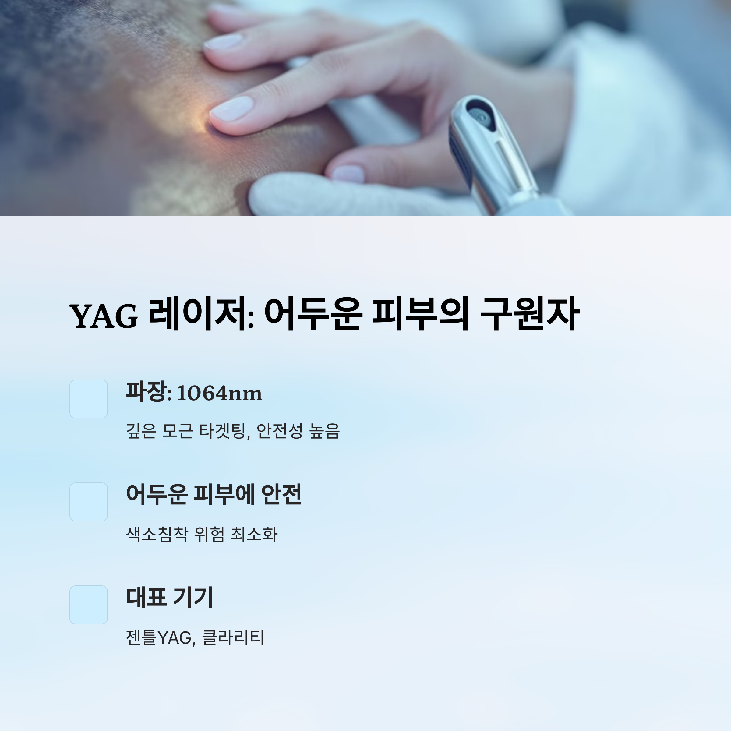| 어두운 피부 + 민감성 | YAG | 깊은 레이저 침투로 안전 |