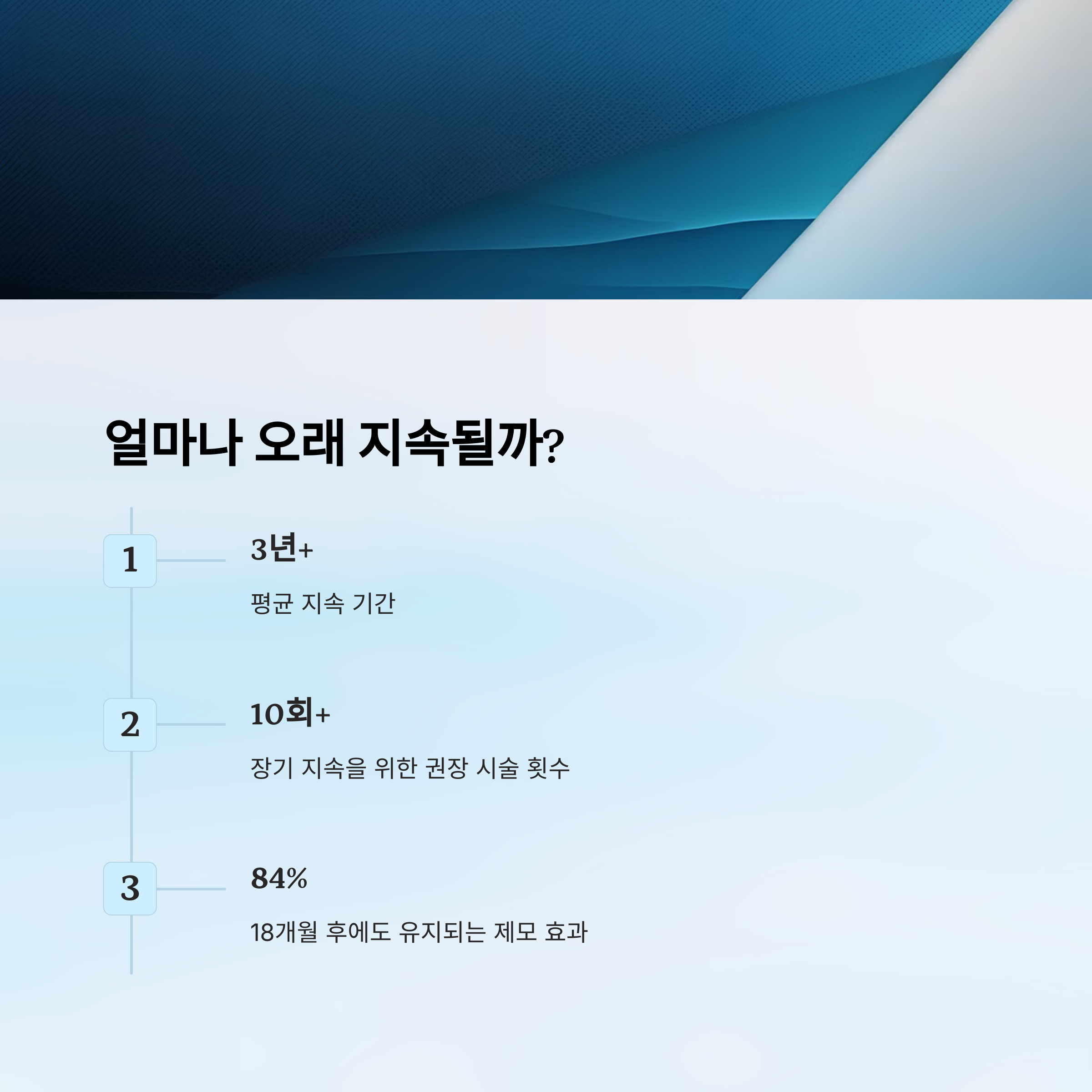 이런 경우를 대비해 연 1~2회 정도 ‘유지 관리 시술’을 받는 걸 추천해요. 이렇게 하면 처음 효과를 오래도록 지속할 수 있어요. 사람마다 다르지만, 6~8회 시술 후 추가 시술 없이 2~3년 지속된 사례도 많아요.