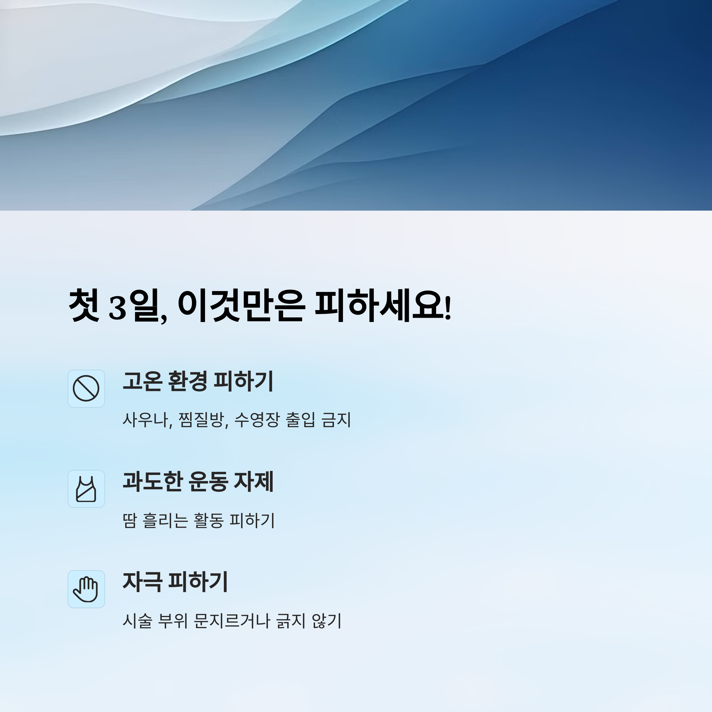 먼저 운동은 시술 후 2~3일은 피하는 게 좋아요. 땀을 많이 흘리면 피부에 염증을 유발할 수 있고, 마찰로 인한 자극도 커질 수 있어요. 간단한 스트레칭 정도만 하는 게 안전해요.