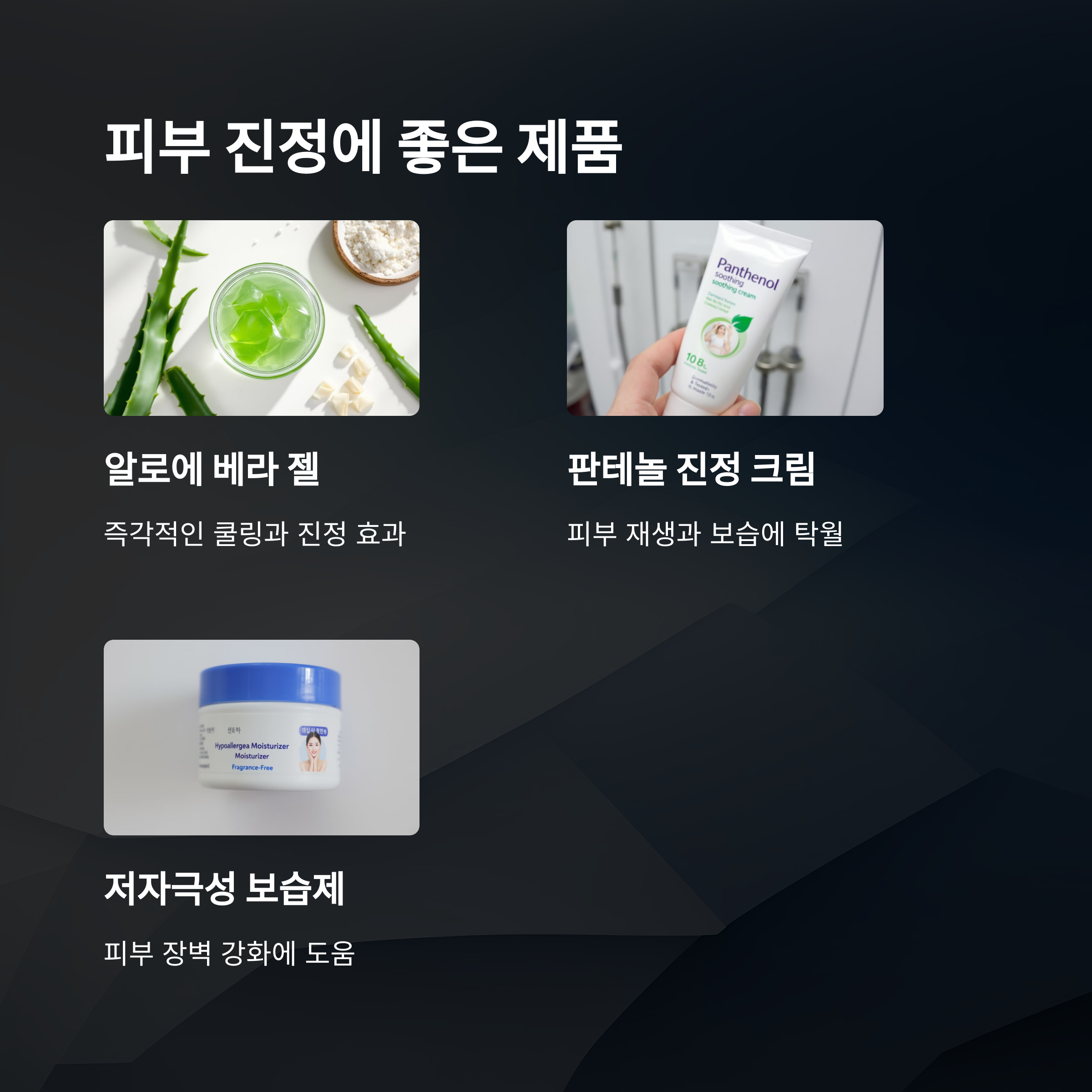 그 다음 단계로는 진정 크림이나 로션을 충분히 도포해줘요. 자극이 적고 향 없는 제품 위주로 선택하는 게 좋아요. 특히 '무향', '무알코올', '저자극' 라벨을 확인하면 안심이에요.