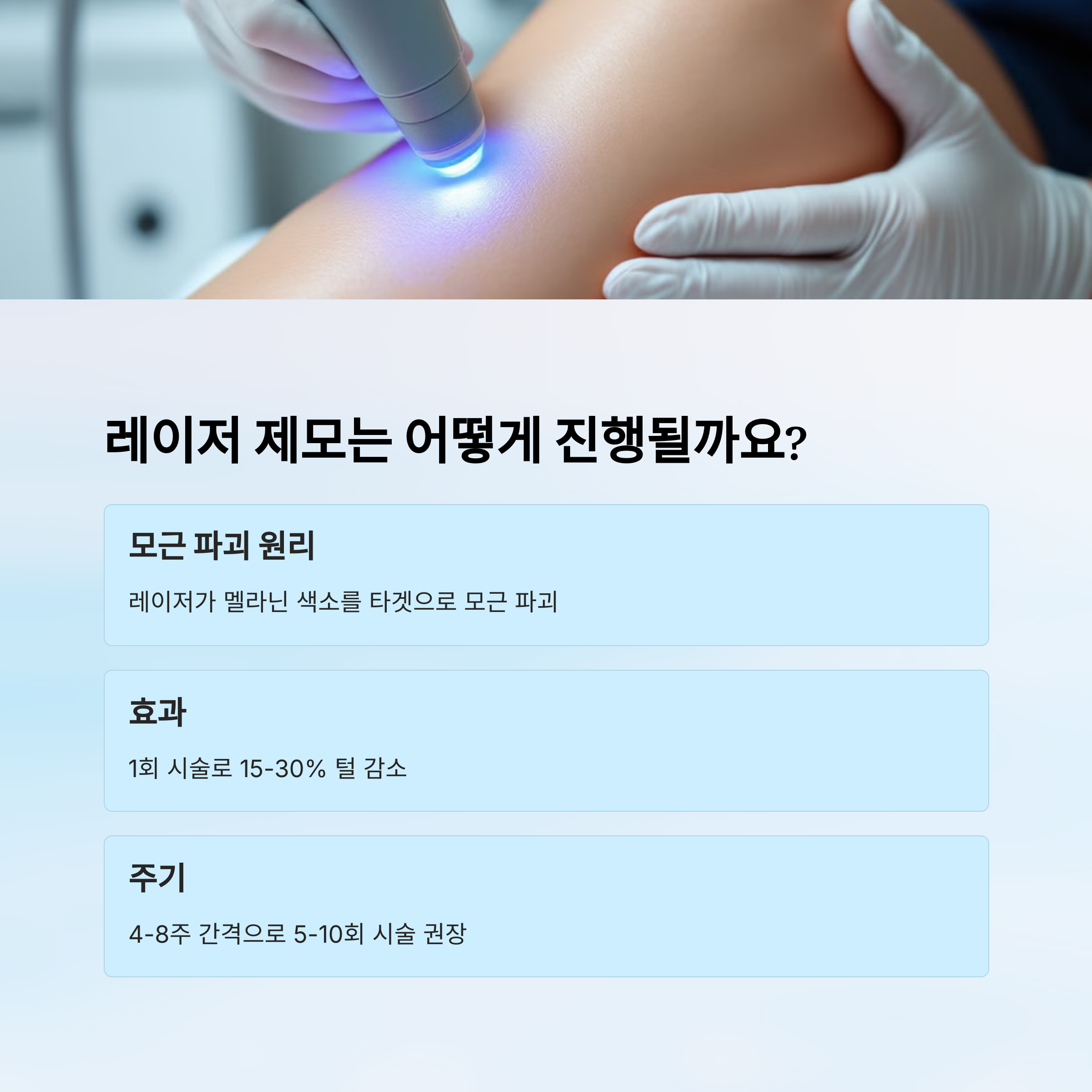 시술 전에는 제모 부위를 미리 면도해두고, 필요시 마취크림을 바르기도 해요. 그다음 클리닉에서는 쿨링젤을 바르고, 레이저 장비로 털을 제거해요. 이 과정에서 털의 멜라닌 색소가 레이저를 흡수하면서 모근이 파괴되는 방식이랍니다.