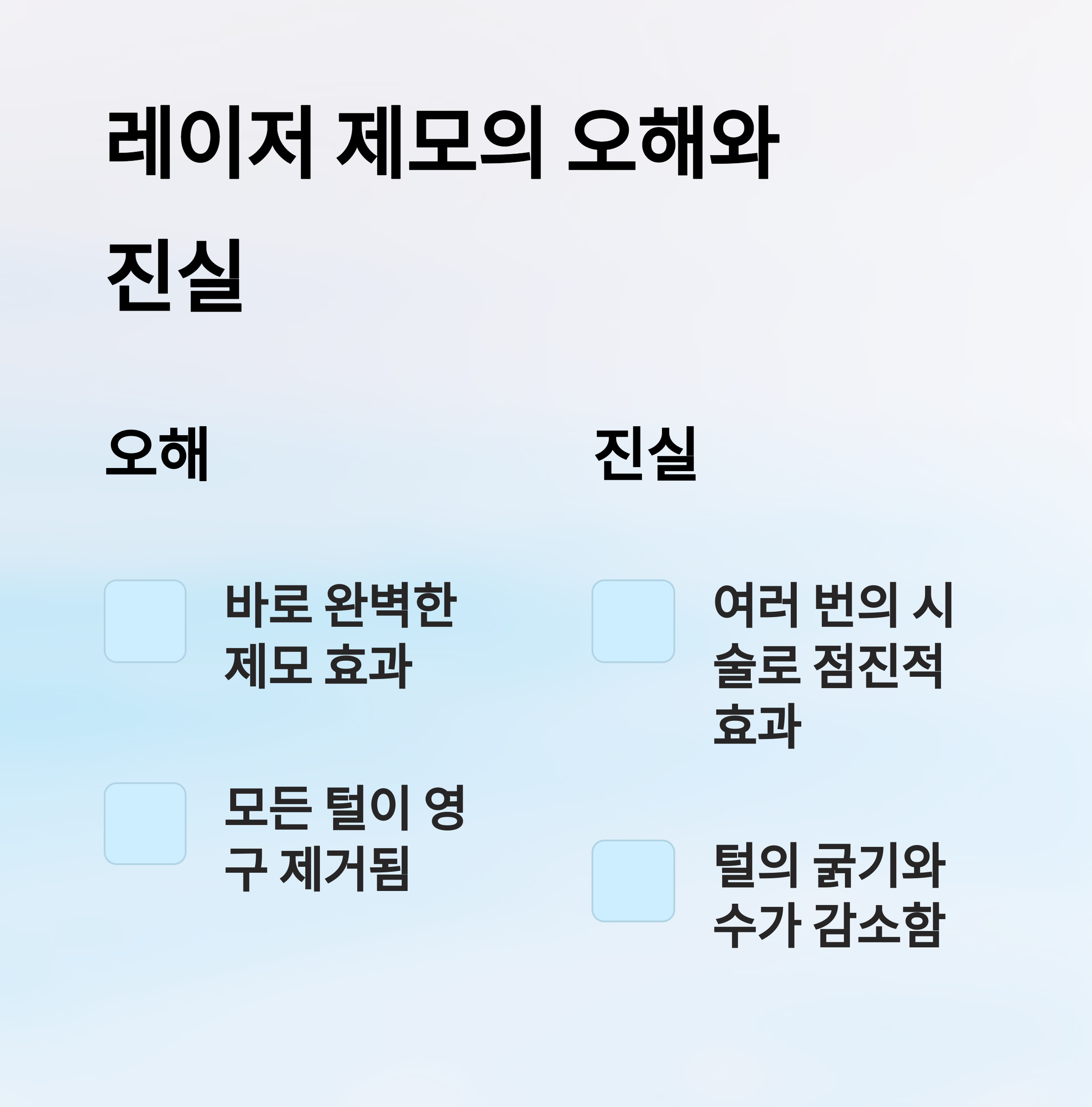 오해 ① "레이저 제모하면 털이 더 굵어져요!" → ❌ 거짓! 사실 털이 자라는 '텀'이 맞물려 그렇게 느껴지는 경우가 있어요. 실제로는 모낭이 점차 약해져 얇고 덜 자라요.