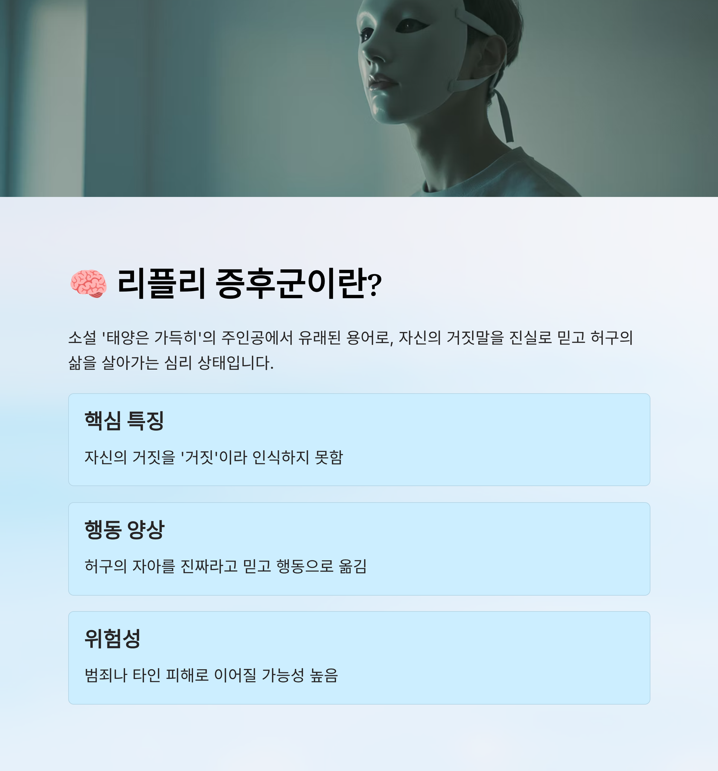 내가 생각했을 때, 리플리 증후군의 무서운 점은 '자신도 모르게 진실과 허구의 경계를 무너뜨리는 심리'에 있어요. 본인은 진심으로 믿고 있지만, 그 믿음은 타인에게는 명백한 거짓으로 받아들여지니 결국 고립을 불러오게 되는 거죠.