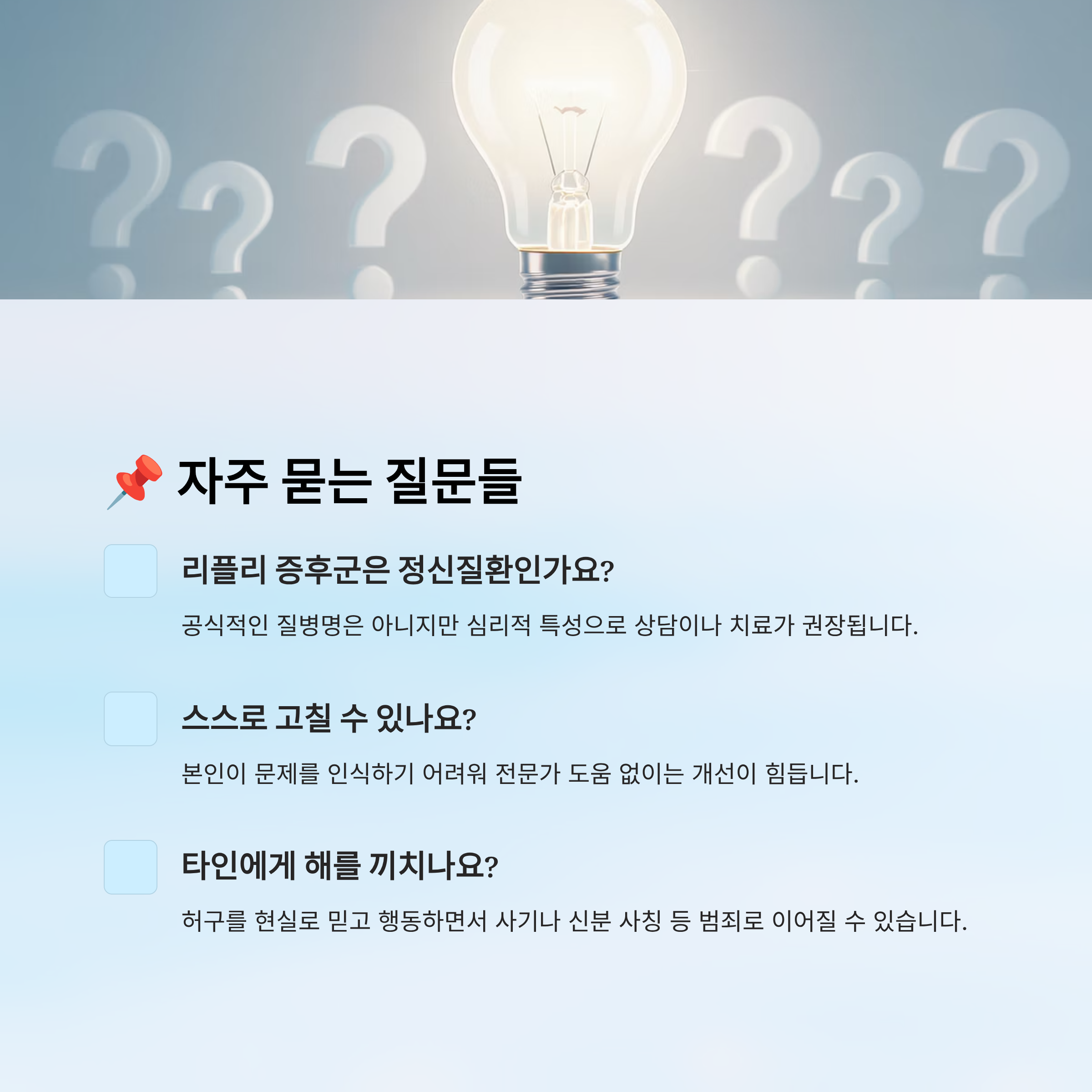 📌 본 콘텐츠는 정보 제공용입니다. 이 글은 정신건강에 대한 일반적 정보를 제공하기 위한 목적이며, 의학적 진단이나 치료를 대체하지 않습니다. 증상이 의심된다면 반드시 정신건강의학과 전문의의 상담을 받아주세요.