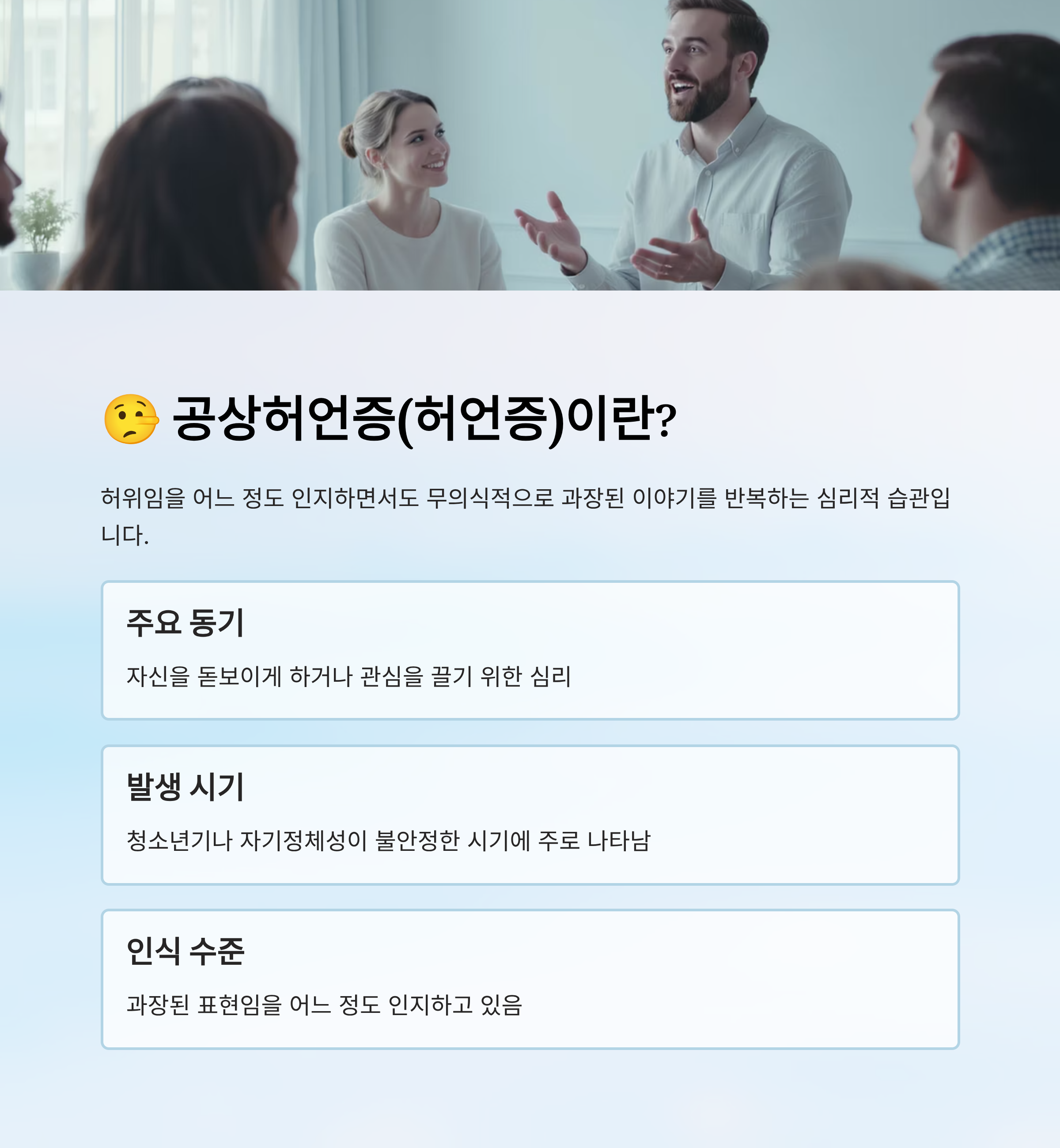 공상허언증은 리플리 증후군과 달리, 허위임을 어느 정도 인지하고 있으면서도 무의식적으로 과장된 이야기를 반복하는 심리적 습관이에요. 흔히 '허언증'이라 불리며, 일상 대화 중에 실제보다 부풀리거나 꾸며낸 이야기를 자주 하는 경향이 있어요.