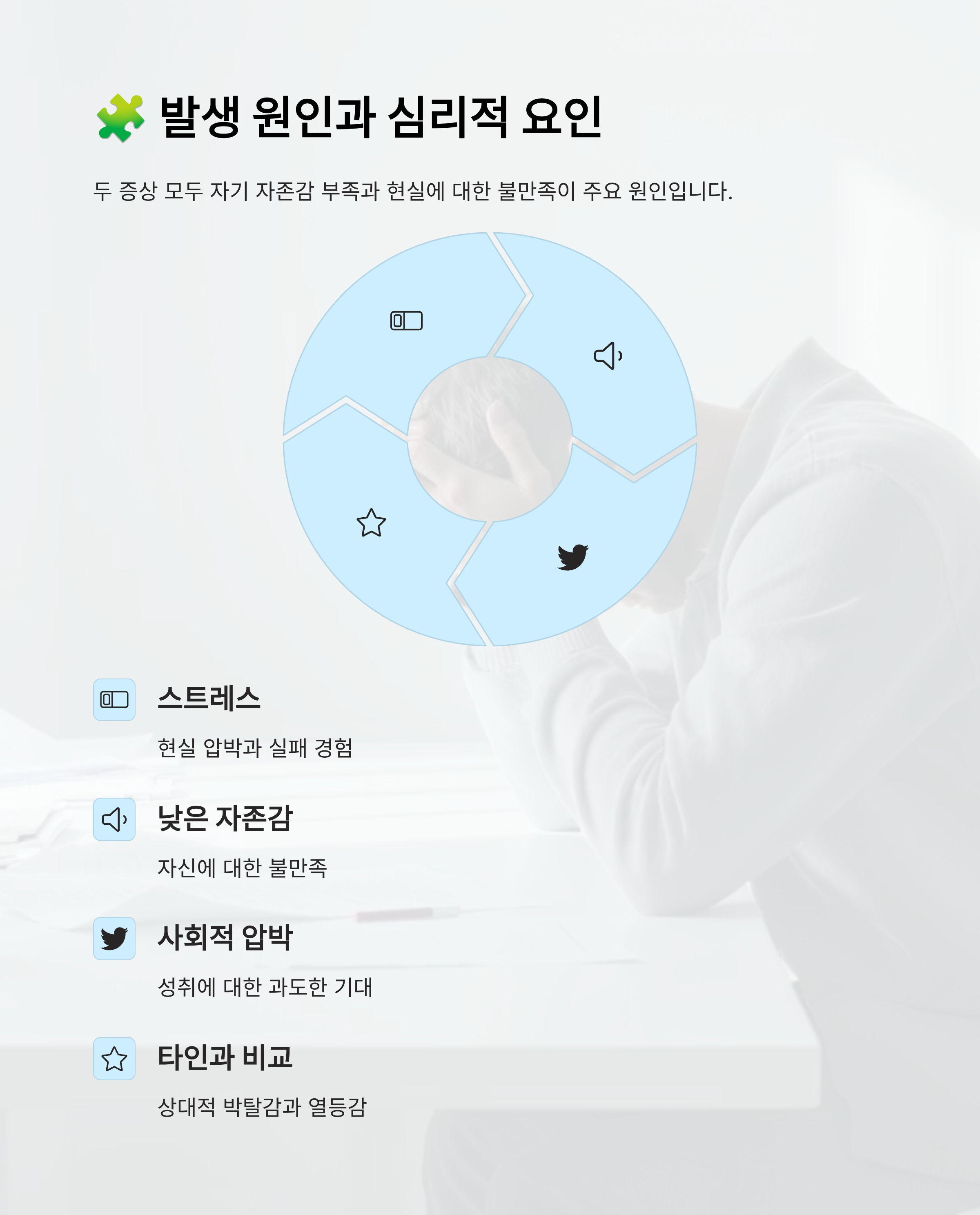 두 증상 모두 자기 자존감 부족과 관련이 깊어요. 현실의 자신에 만족하지 못하거나, 타인과 비교하며 자신을 작게 느끼는 경우 이러한 증상이 나타날 확률이 높아진답니다.