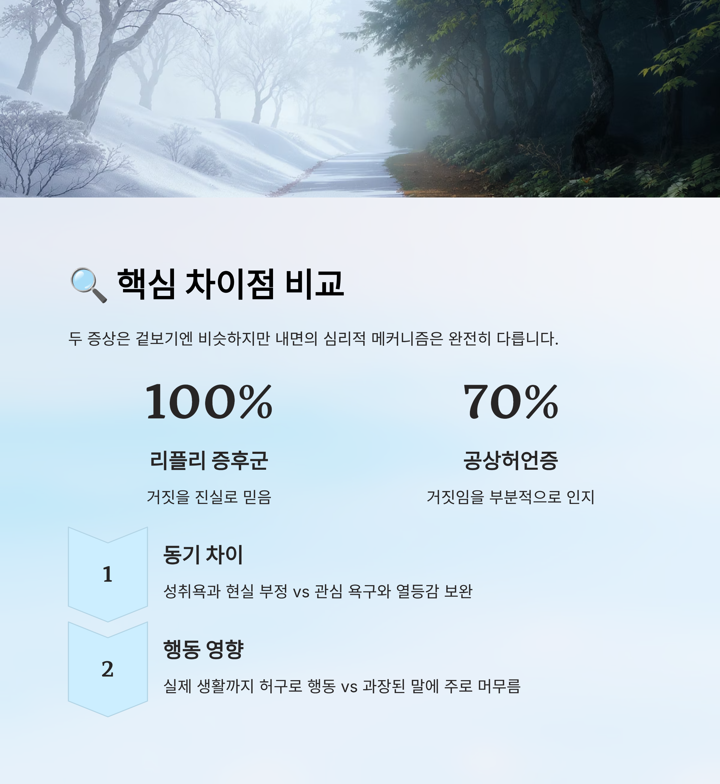 둘 다 '거짓을 말한다'는 겉모습은 같아 보여도, 내면에서 작동하는 심리적 메커니즘은 완전히 달라요. 그래서 치료나 상담에서도 구분해서 접근하는 게 중요하답니다.
