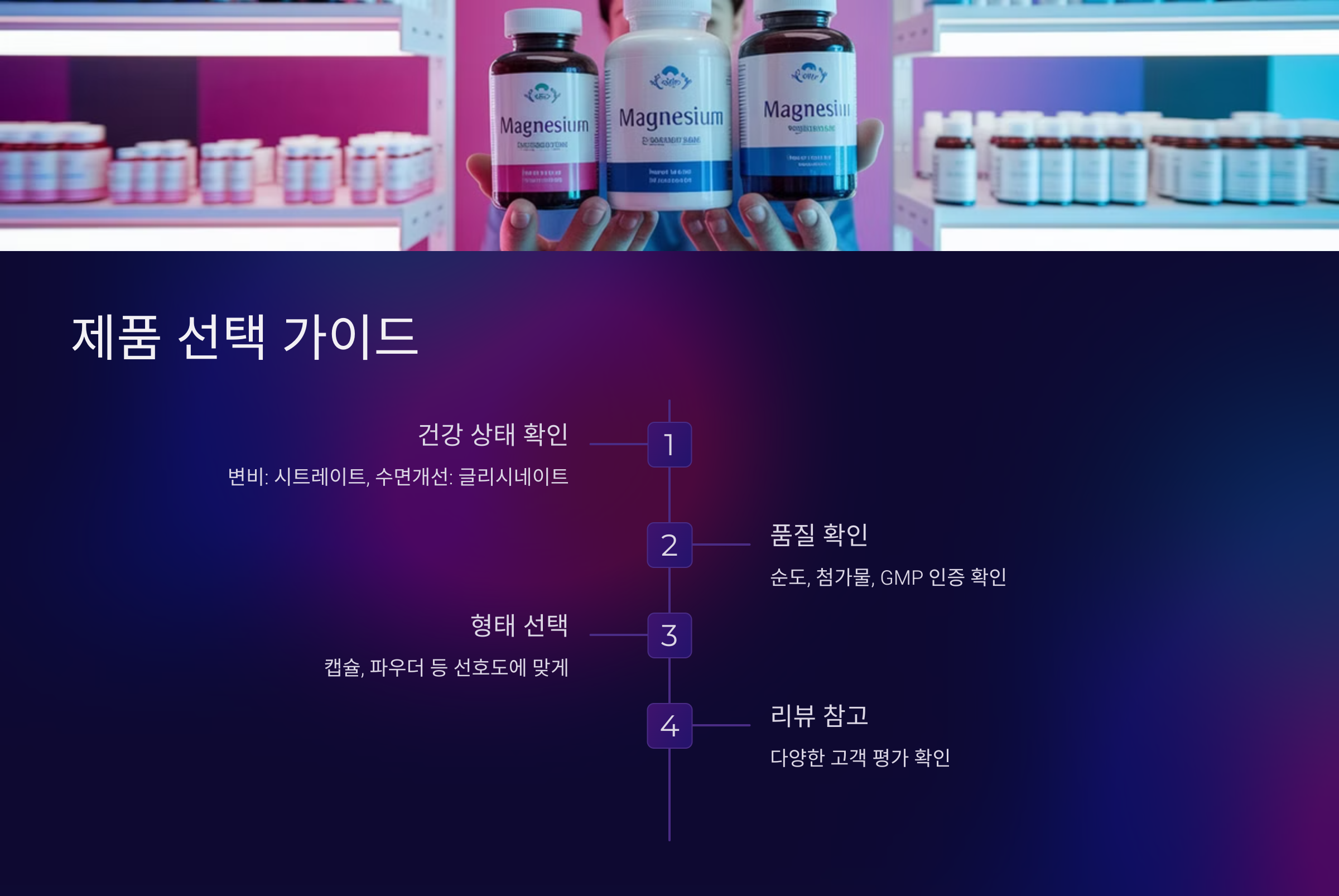 마그네슘 보충제를 선택할 때는 몇 가지 핵심 포인트를 기억해 두세요. 우선, 자신의 건강 상태와 필요에 따라 제품 형태를 결정하는 것이 중요해요. 변비가 있다면 시트레이트 형태, 수면 개선을 원한다면 글리시네이트가 적합할 수 있어요.