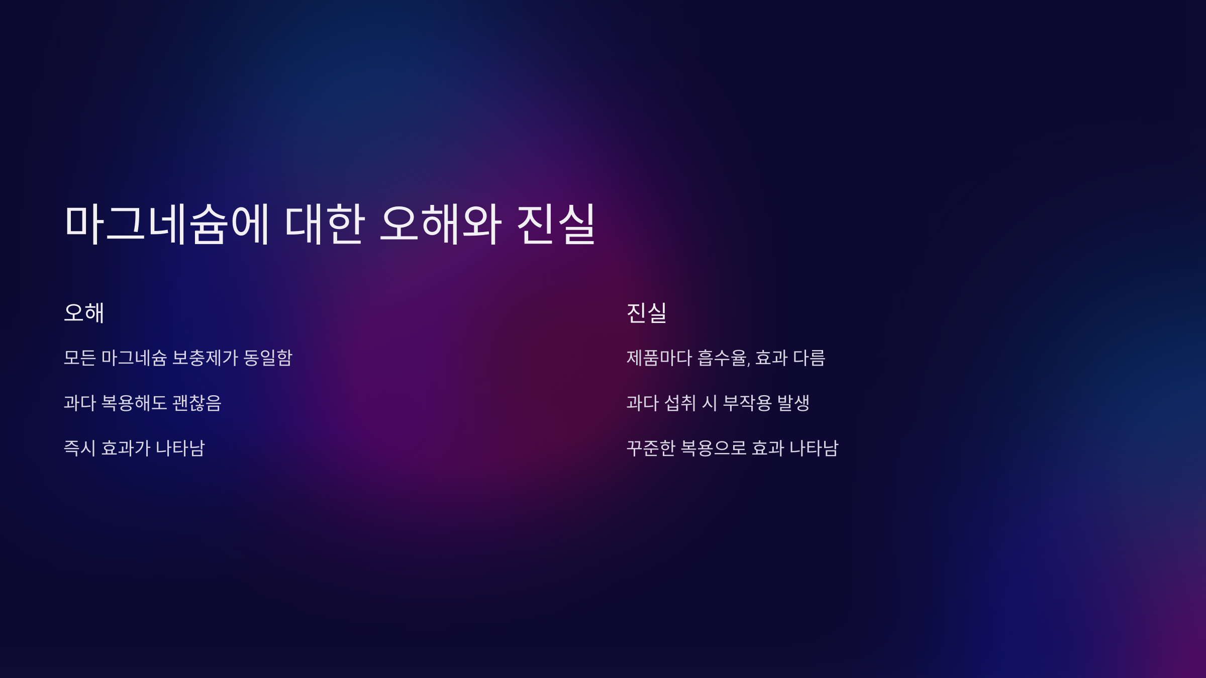 "마그네슘은 바로 효과를 본다"는 주장도 오해일 수 있어요. 대부분의 경우, 마그네슘은 꾸준히 복용해야 효과를 느낄 수 있어요. 특정 증상을 개선하려면 몇 주 이상 복용이 필요할 수 있답니다.