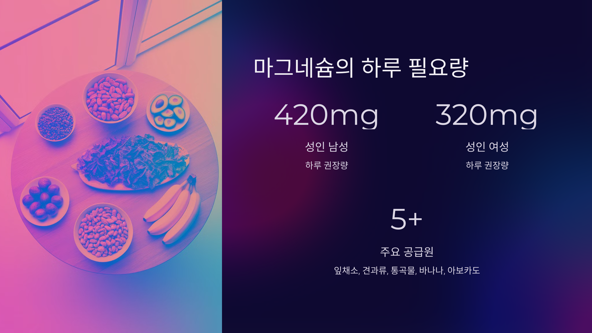 마그네슘의 권장 섭취량은 연령, 성별, 생리적 상태에 따라 달라요. 일반적으로 성인 남성은 하루 400~420mg, 여성은 310~320mg을 섭취하는 것이 좋아요. 임신 중인 여성은 필요량이 약간 증가할 수 있어요.