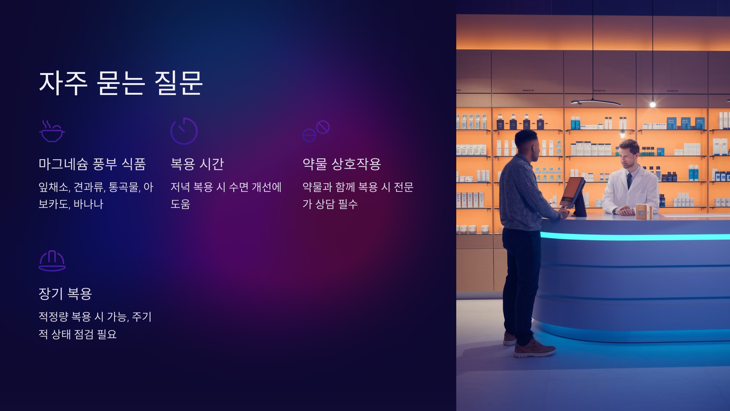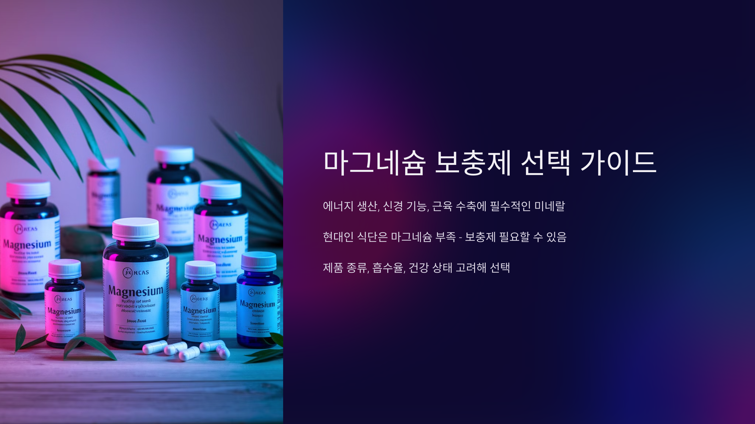 마그네슘은 우리 몸에서 중요한 역할을 담당하는 필수 미네랄이에요. 에너지 생산, 신경 기능, 근육 수축과 이완 등 다양한 생리 작용에 관여하죠. 하지만 현대인의 식단은 마그네슘이 부족한 경우가 많아 보충제가 필요할 때가 있어요.