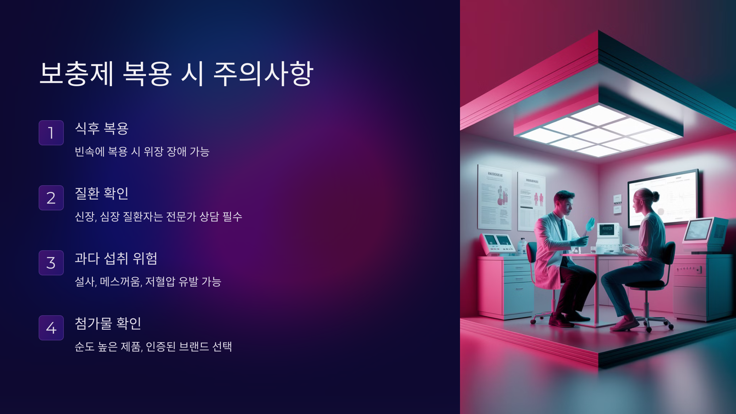 신장 질환이나 심장 질환이 있는 경우, 마그네슘 보충제가 신체에 부정적인 영향을 미칠 수 있으니 반드시 전문가와 상담해야 해요. 특히, 특정 약물을 복용 중이라면 마그네슘이 약물의 효과를 방해할 가능성도 있어요.