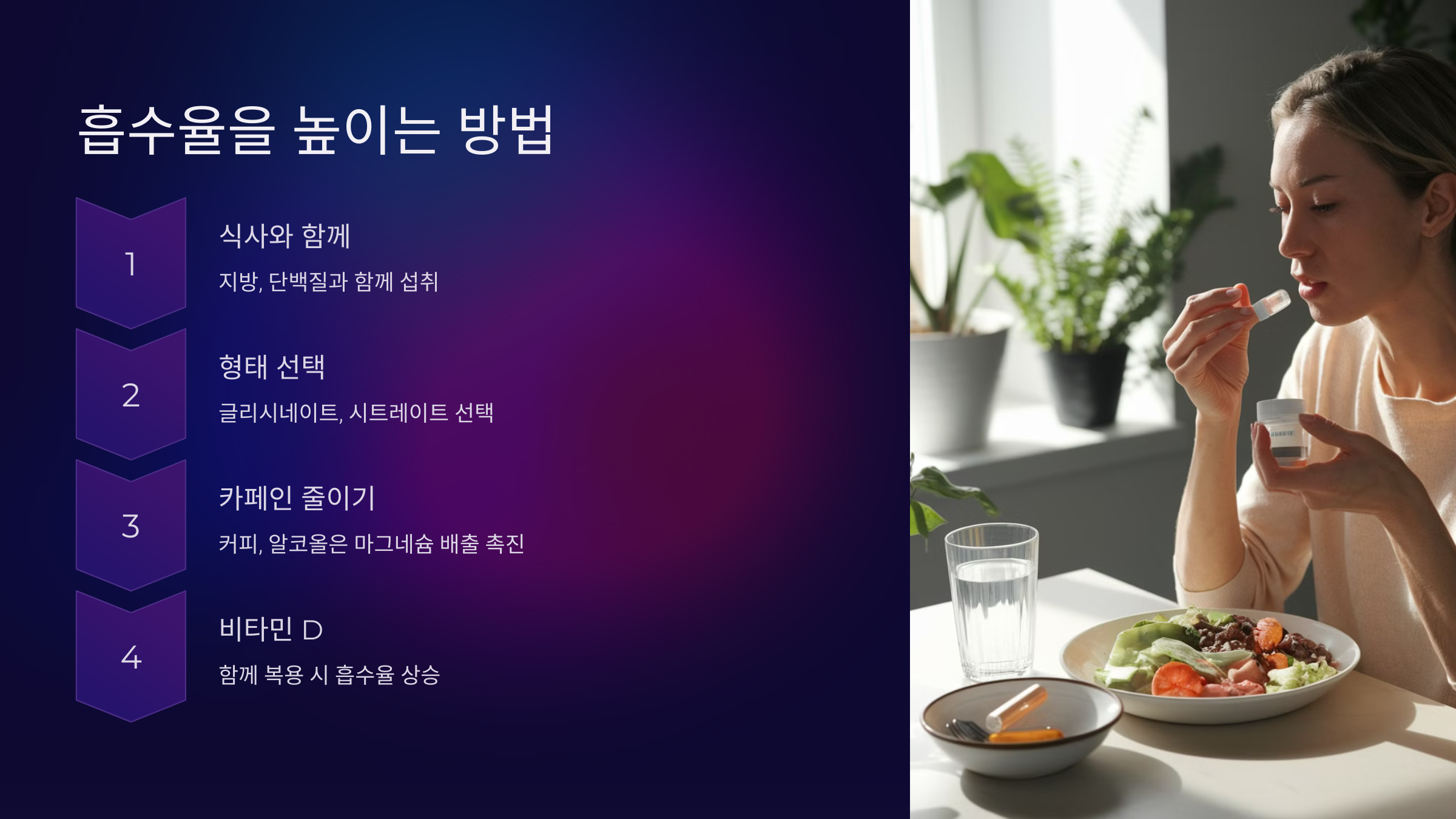 마그네슘의 흡수율은 형태에 따라 다르기 때문에, 글리시네이트나 시트레이트 같은 형태를 선택하는 것이 중요해요. 이러한 형태는 체내에서 빠르고 효율적으로 흡수돼요. 반면, 산화 마그네슘은 흡수율이 낮아 장기적으로 권장되지 않아요.