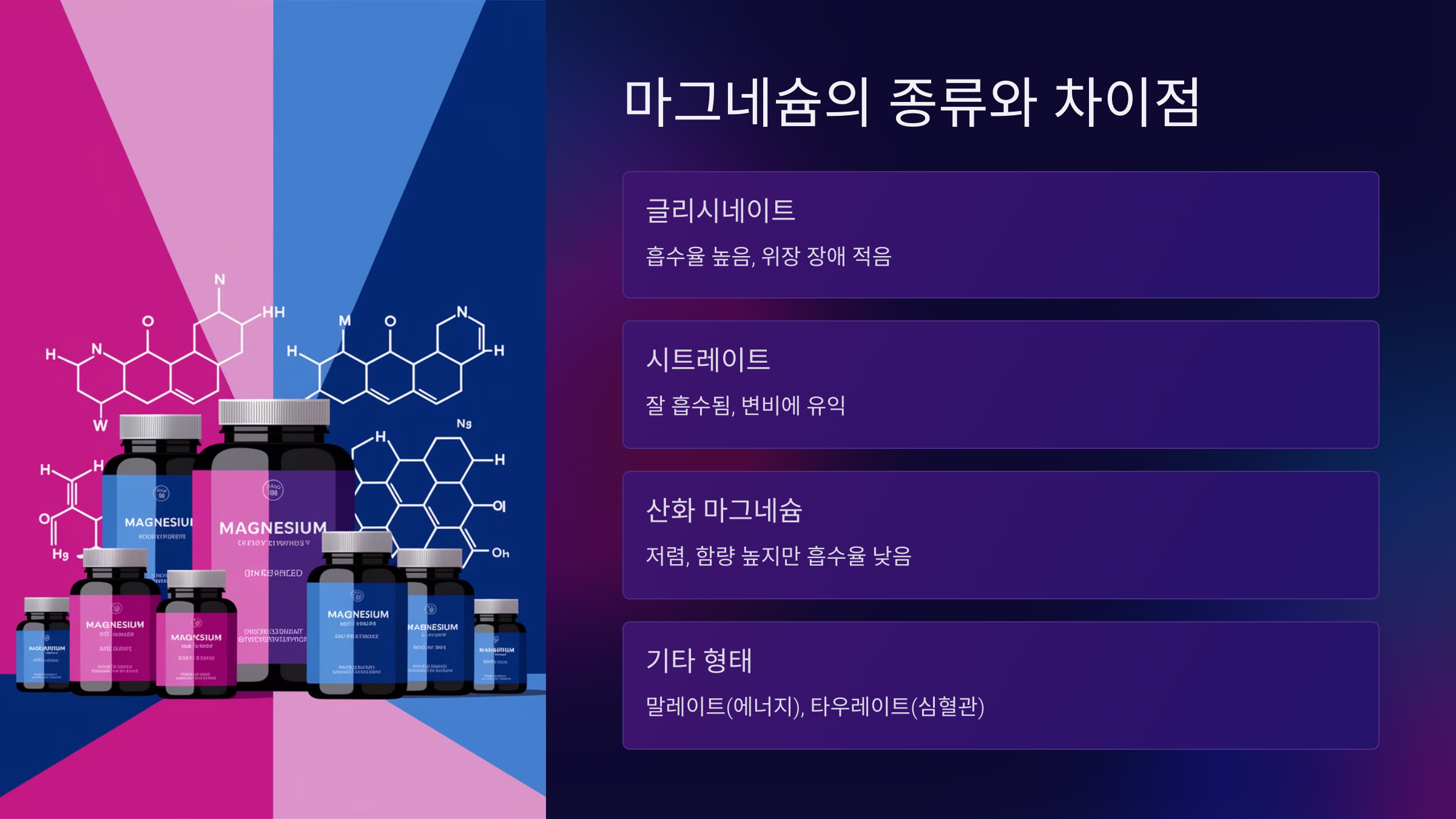 마그네슘 보충제는 다양한 형태로 제공되며, 각각의 특성과 흡수율이 달라요. 대표적인 형태로는 마그네슘 글리시네이트, 시트레이트, 산화 마그네슘 등이 있어요. 이 중 글리시네이트는 흡수율이 높고 위장 장애가 적어 민감한 분들에게 적합해요.