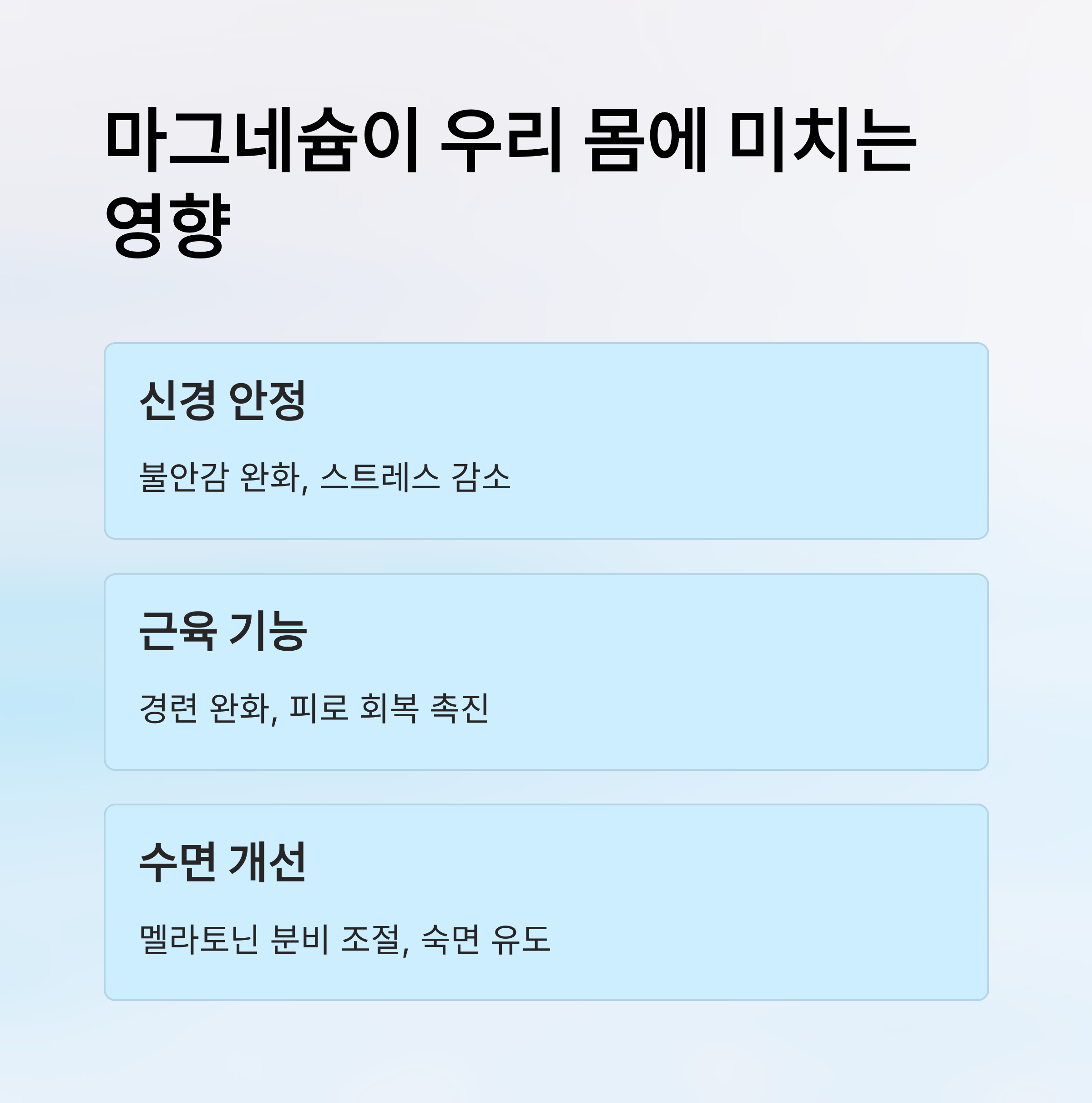 | 근육 이완 | 경련, 눈 떨림 완화 | 운동 후 회복 촉진 |