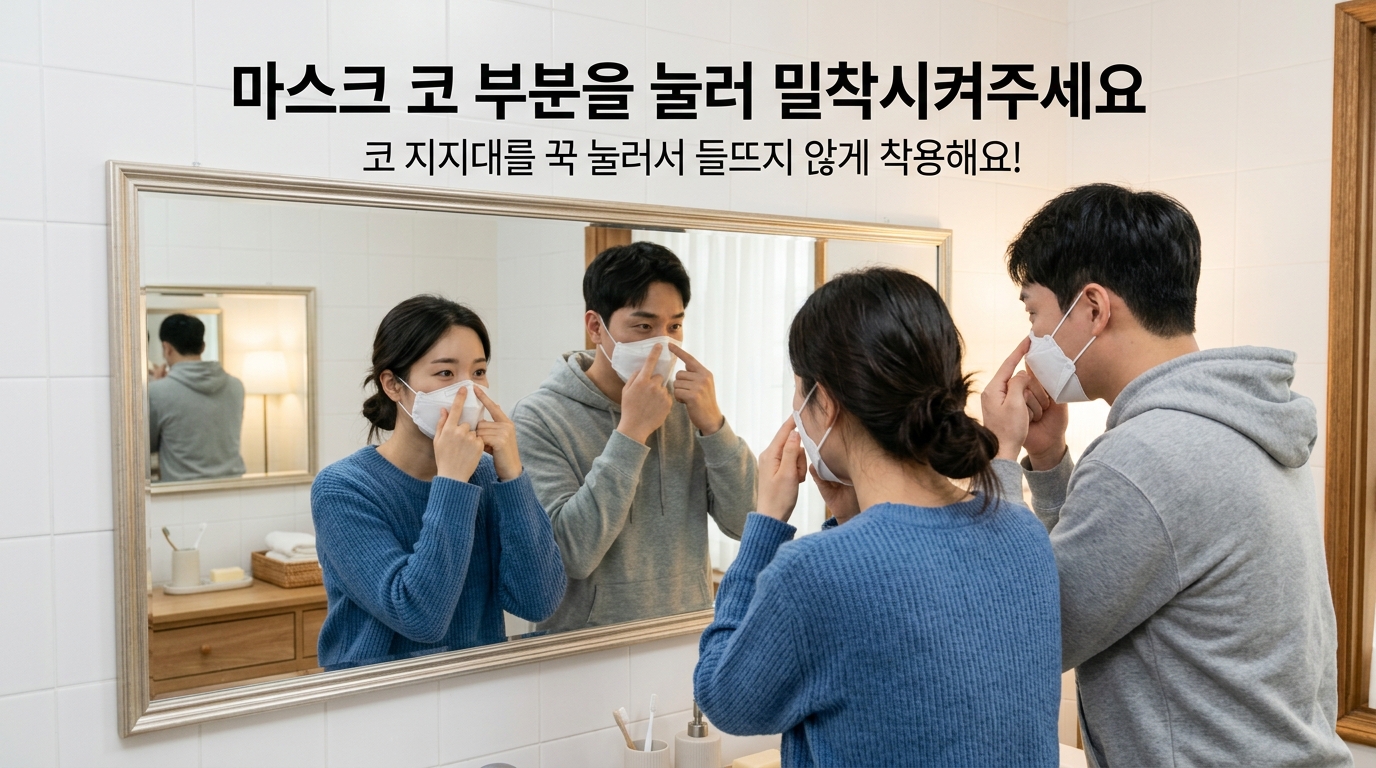 아무리 좋은 KF94 마스크를 써도 얼굴과 마스크 사이에 틈이 있다면 효과가 반감됩니다. 코 부분의 코편(고정심)을 콧대에 맞춰 꾹 눌러주는 것이 가장 중요합니다.