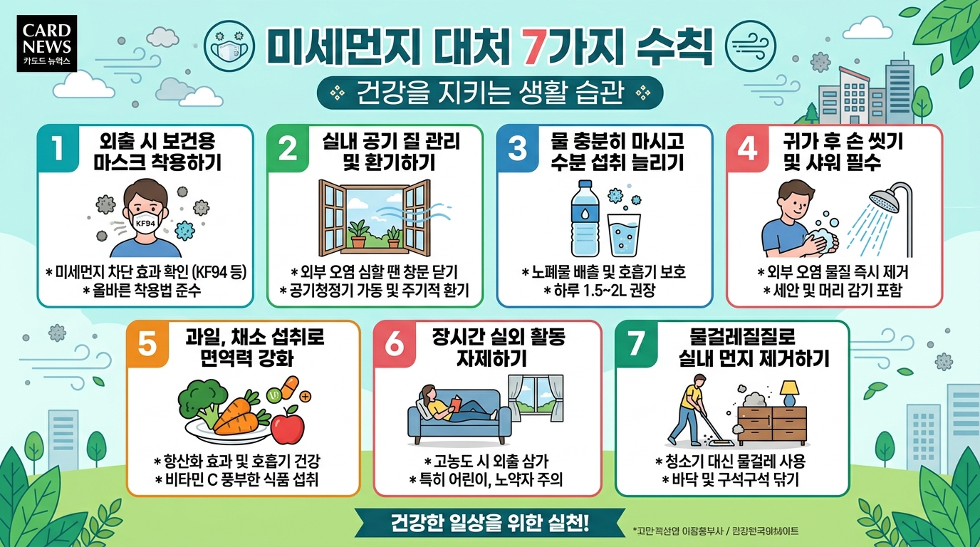 또한, 대기 오염물질이 정체되기 쉬운 새벽 시간대보다는 대기가 순환되는 오후 시간대에 잠시 환기나 필수적인 외출을 하는 것이 유리합니다.